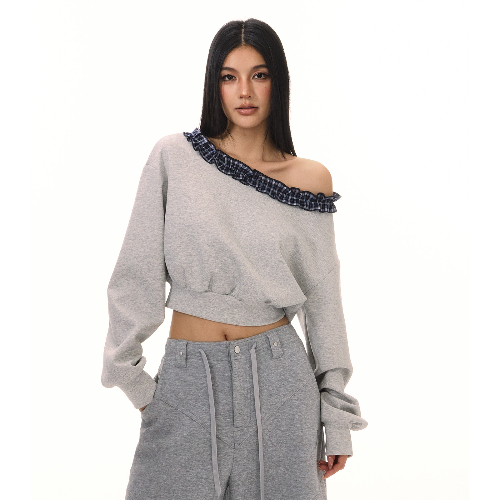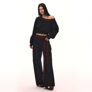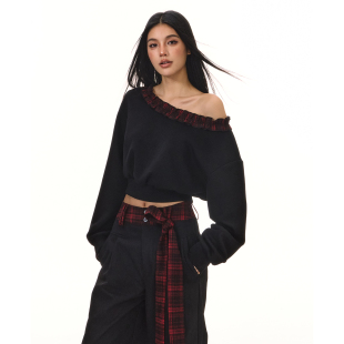 上衣 套头卫衣女外穿长袖 ACMEAURA秋冬美式 复古斜肩露肩木耳边长袖