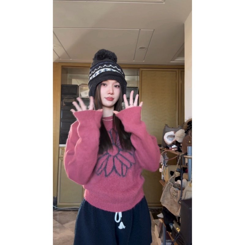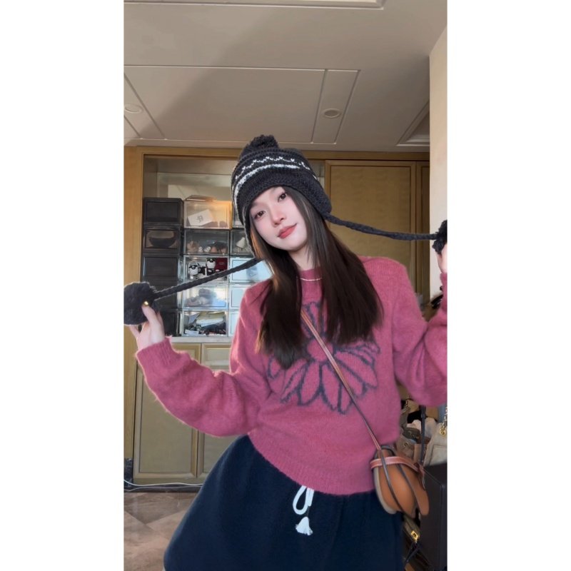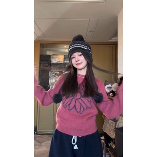 慵懒风针织毛针织衫 可爱小玫菊 上衣圆领套头撞色女冬季 TIAO