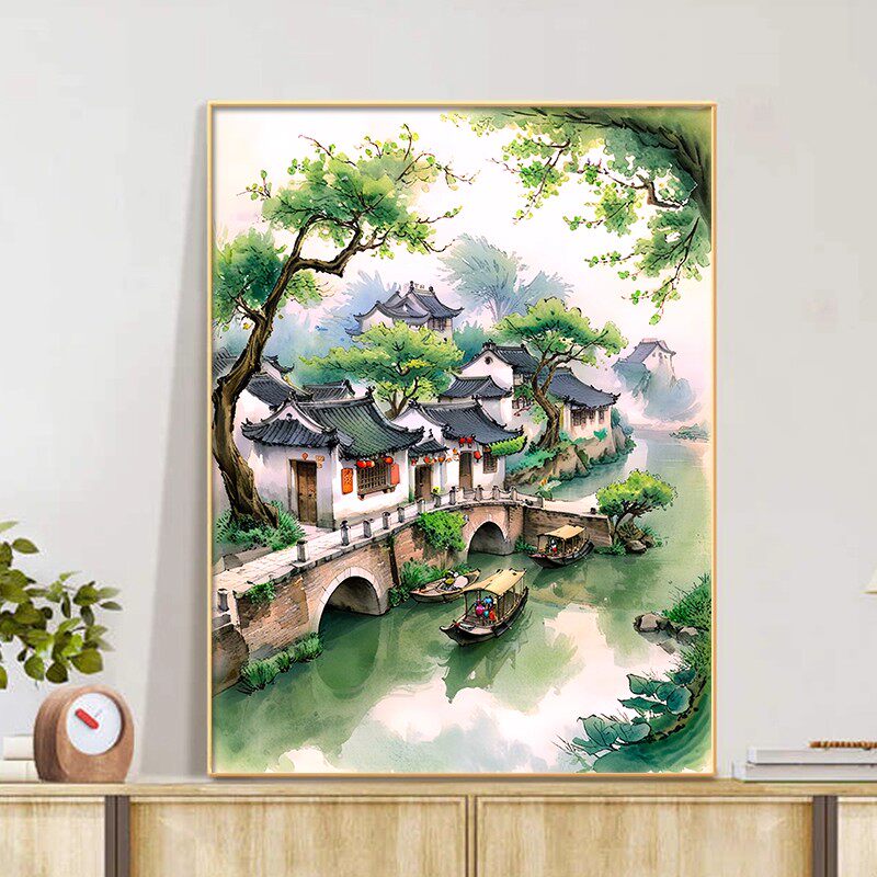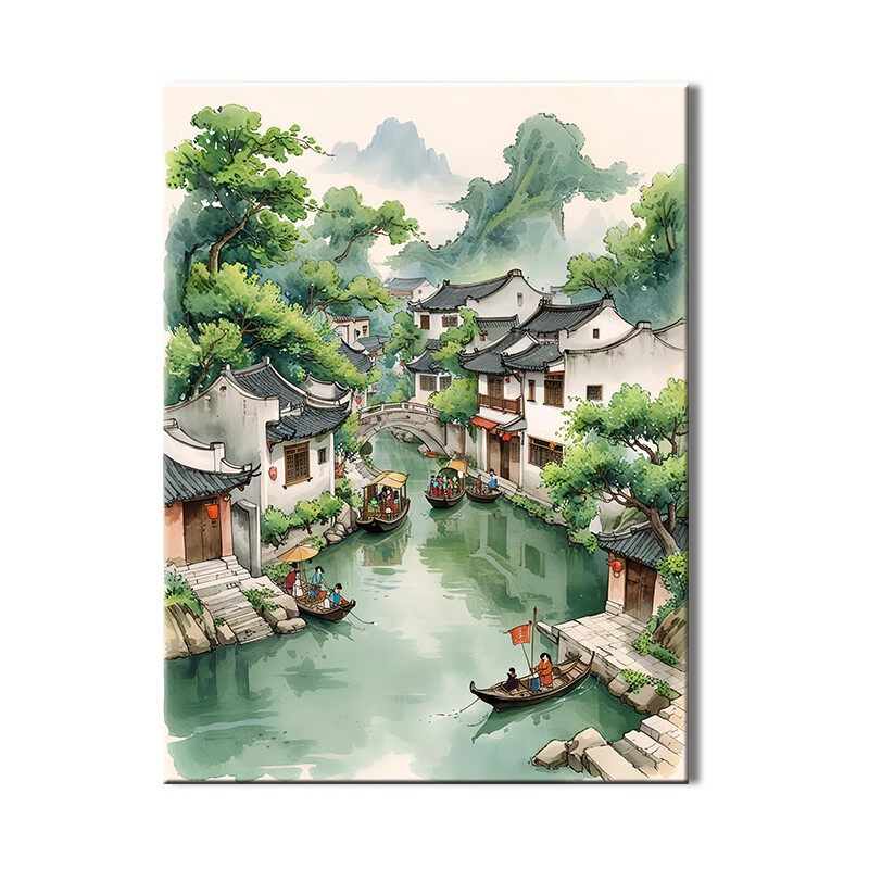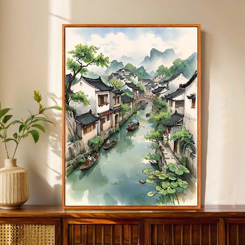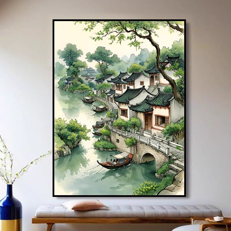江南行舟卡通装 清新卧室客厅摆挂画 饰画成品仿油画风景建筑新中式