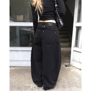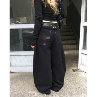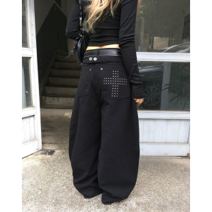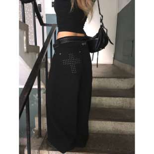 男女高街宽松显瘦垂感阔腿休闲裤 复古铆钉十字弯刀牛仔裤 美式 大码