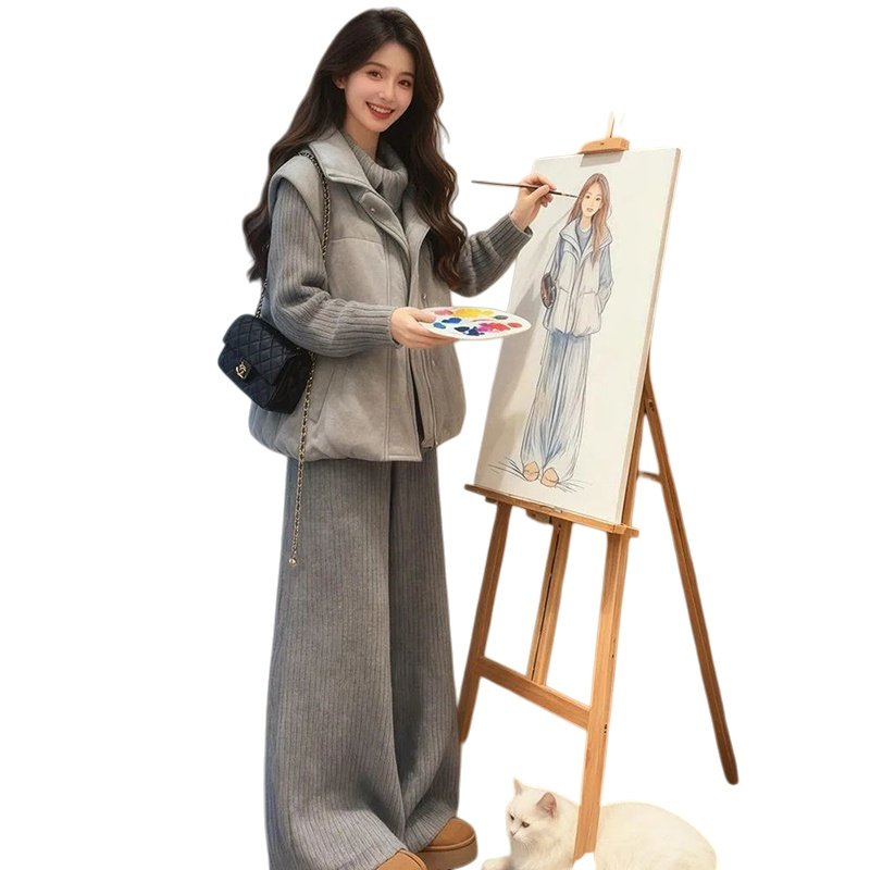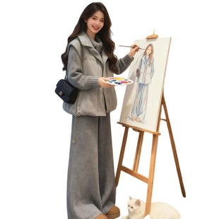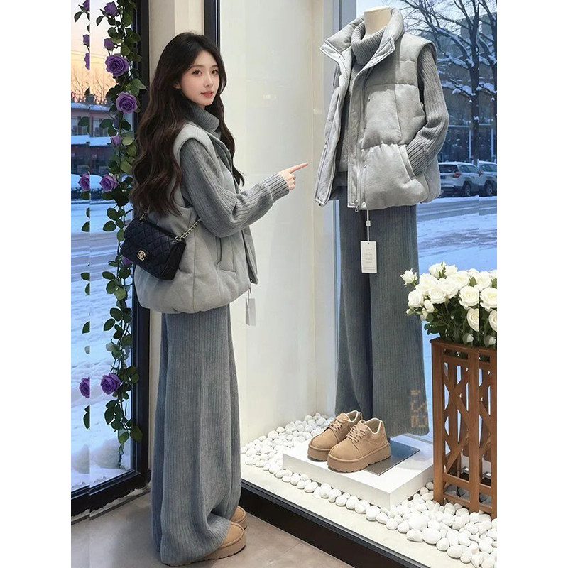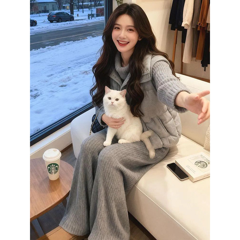 棉服背心马甲潮 毛衣 冬日慵懒风穿搭一整套灰色阔腿长裤 针织开衫