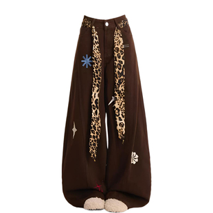 女装 胖mm显瘦阔腿裤 美式 女新款 子 豹纹拼接刺绣牛仔裤 300斤特大码