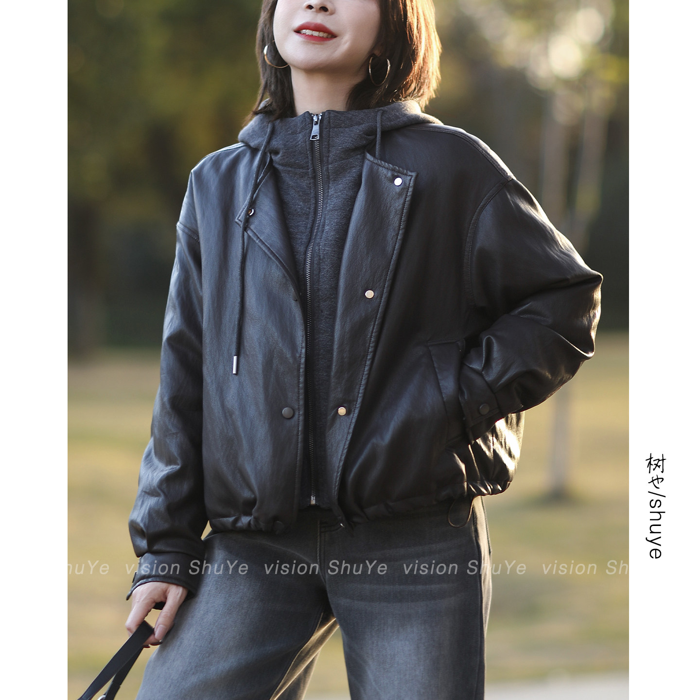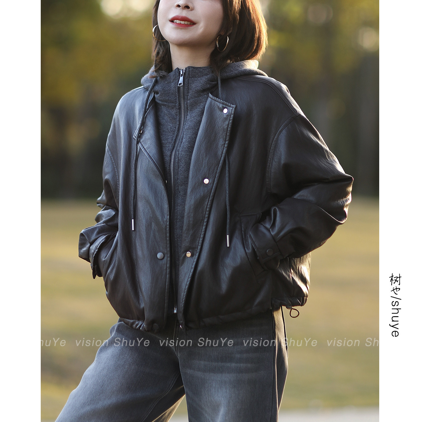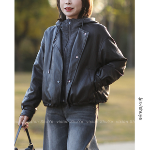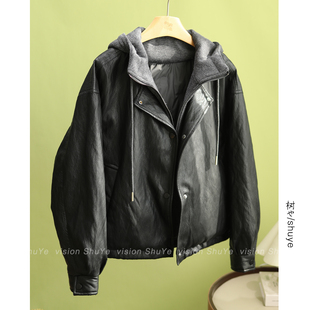 休闲宽松柔软蛋白皮连帽假两件羽绒服皮衣 韩版 树也2025冬装 新款