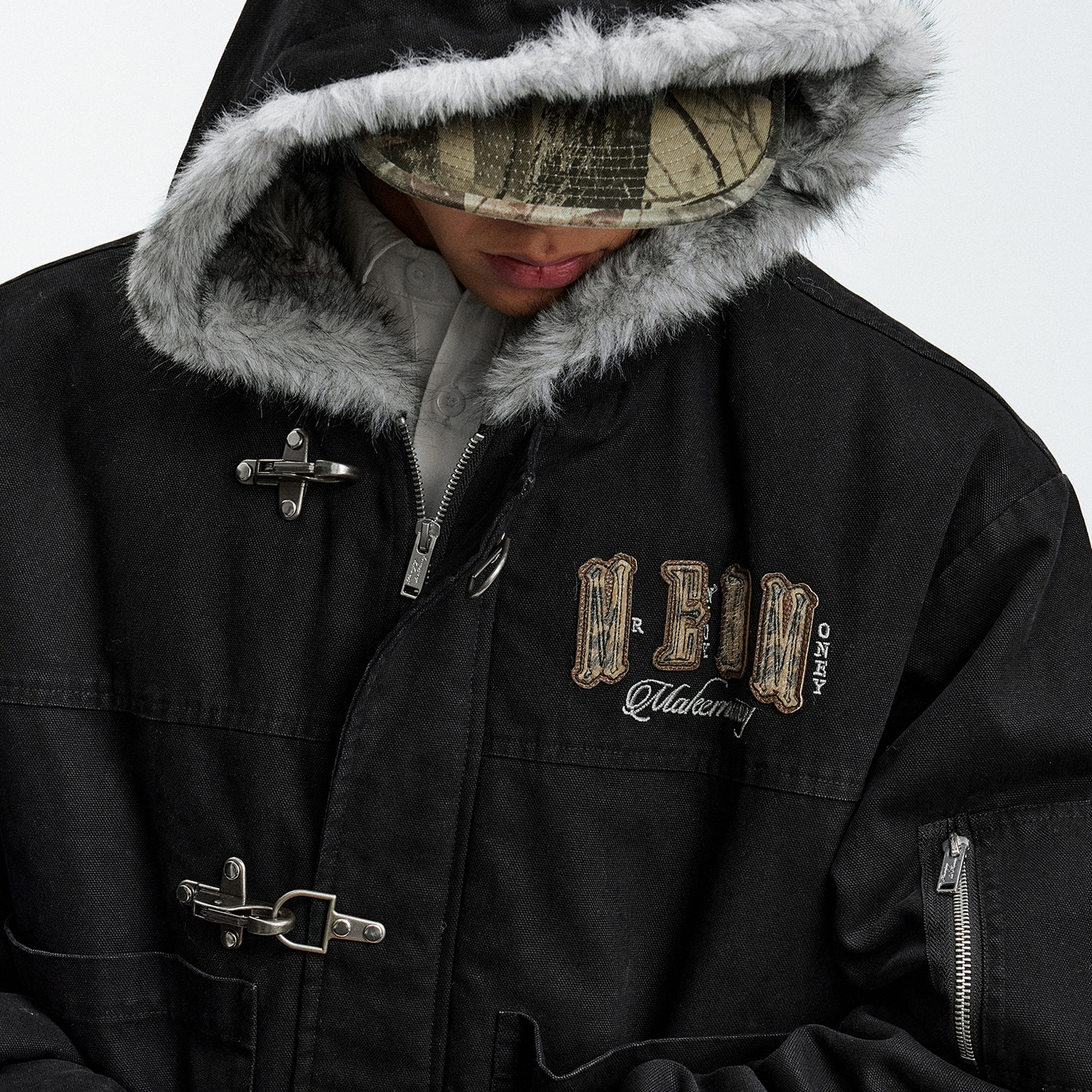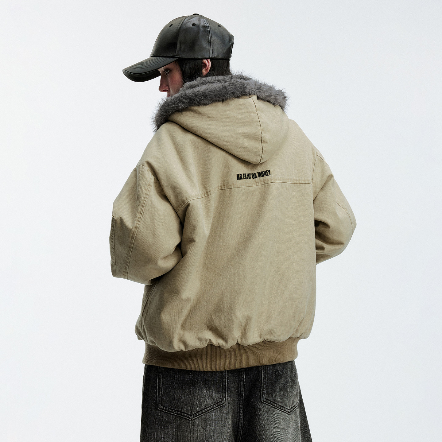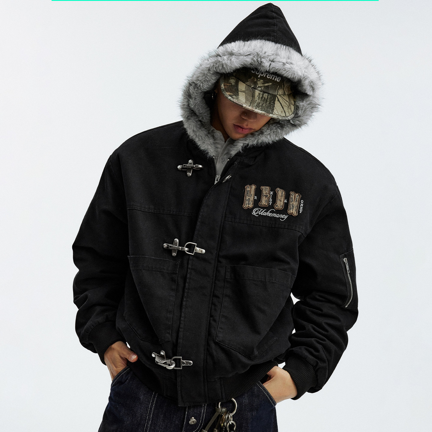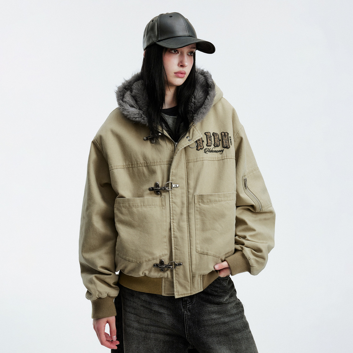 MEDM 帆布毛帽飞机扣棉保暖宽松连帽夹克潮流男女百搭休闲外套冬