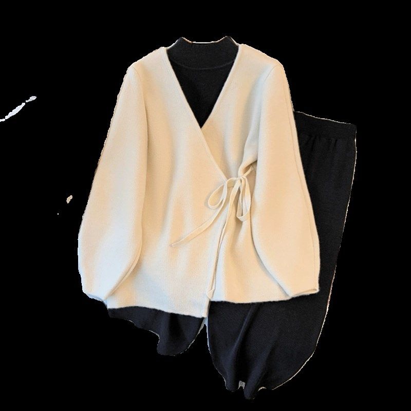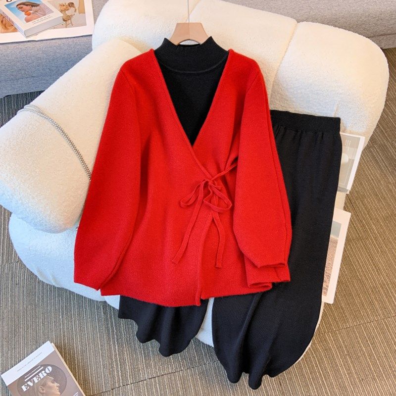 中年大码 三件套装 女装 外套打底毛衣阔腿裤 胖妈妈针织开衫 秋冬新款