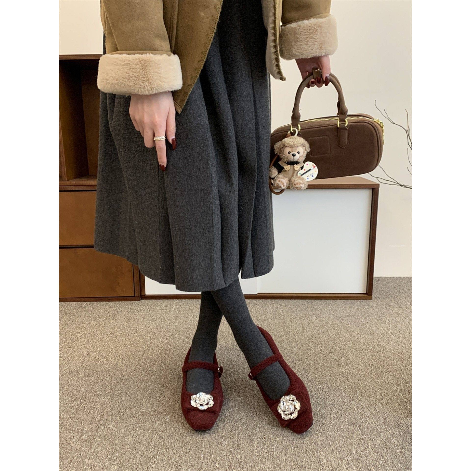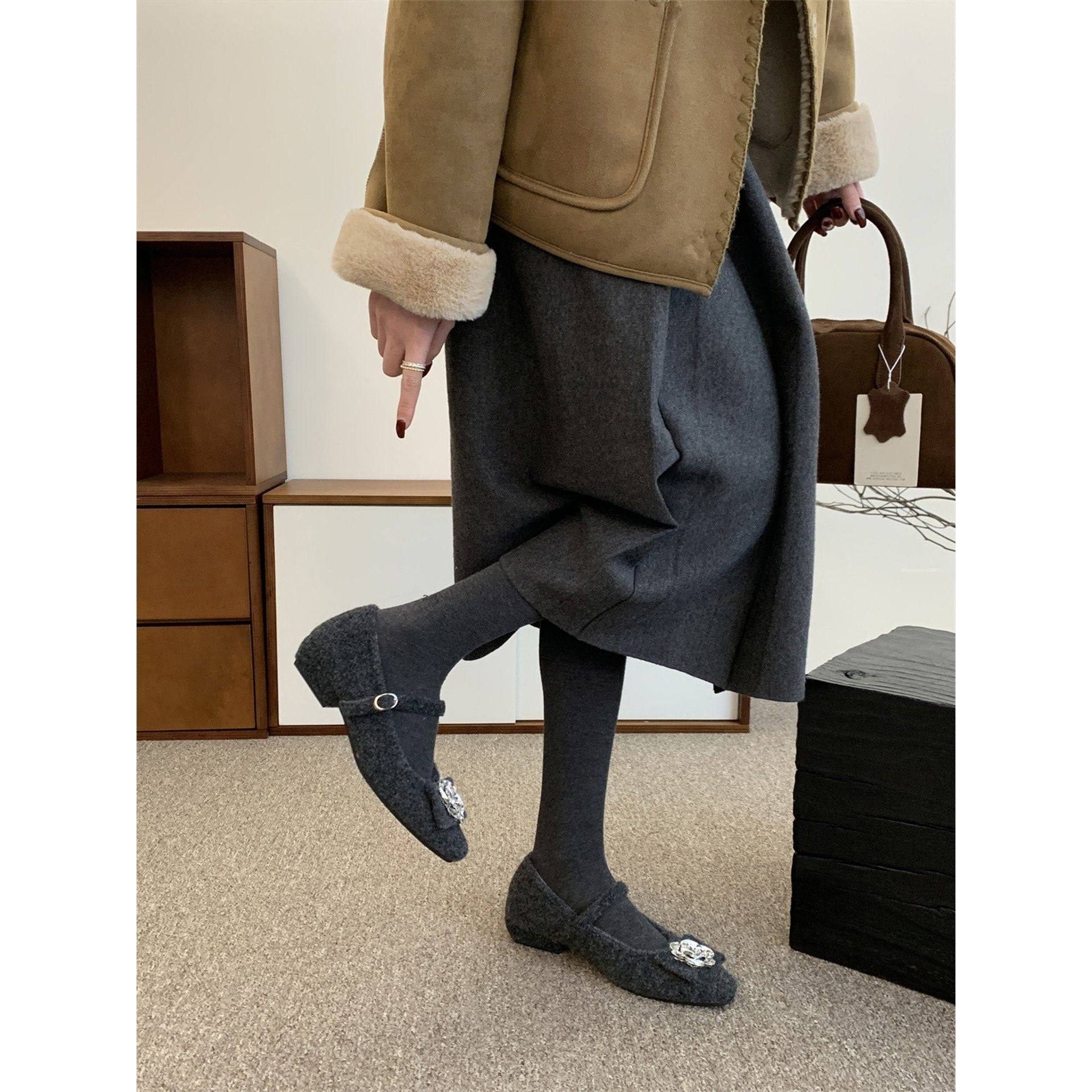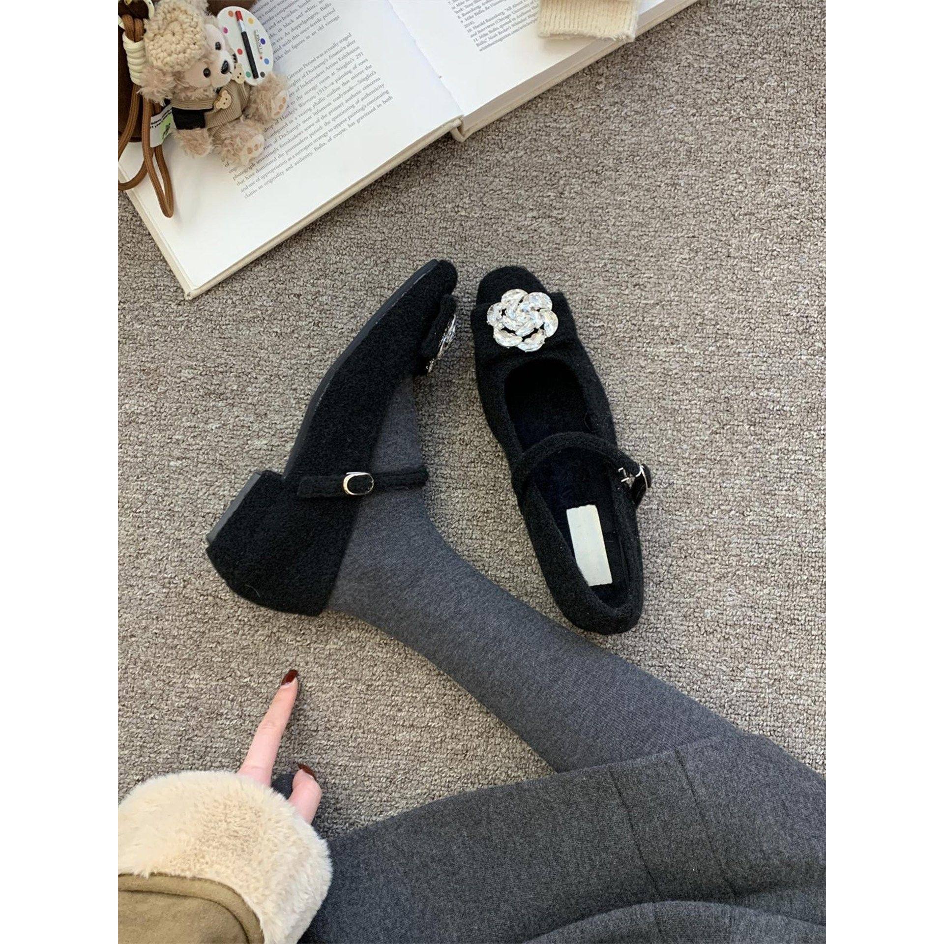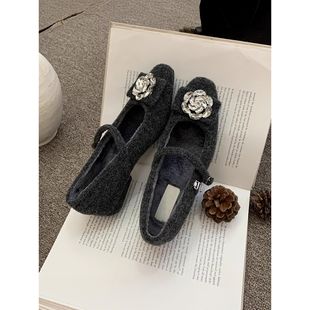 方头浅口单鞋 女鞋 女冬平底2025新款 大码 方扣水钻配裙子瓢鞋 米霏