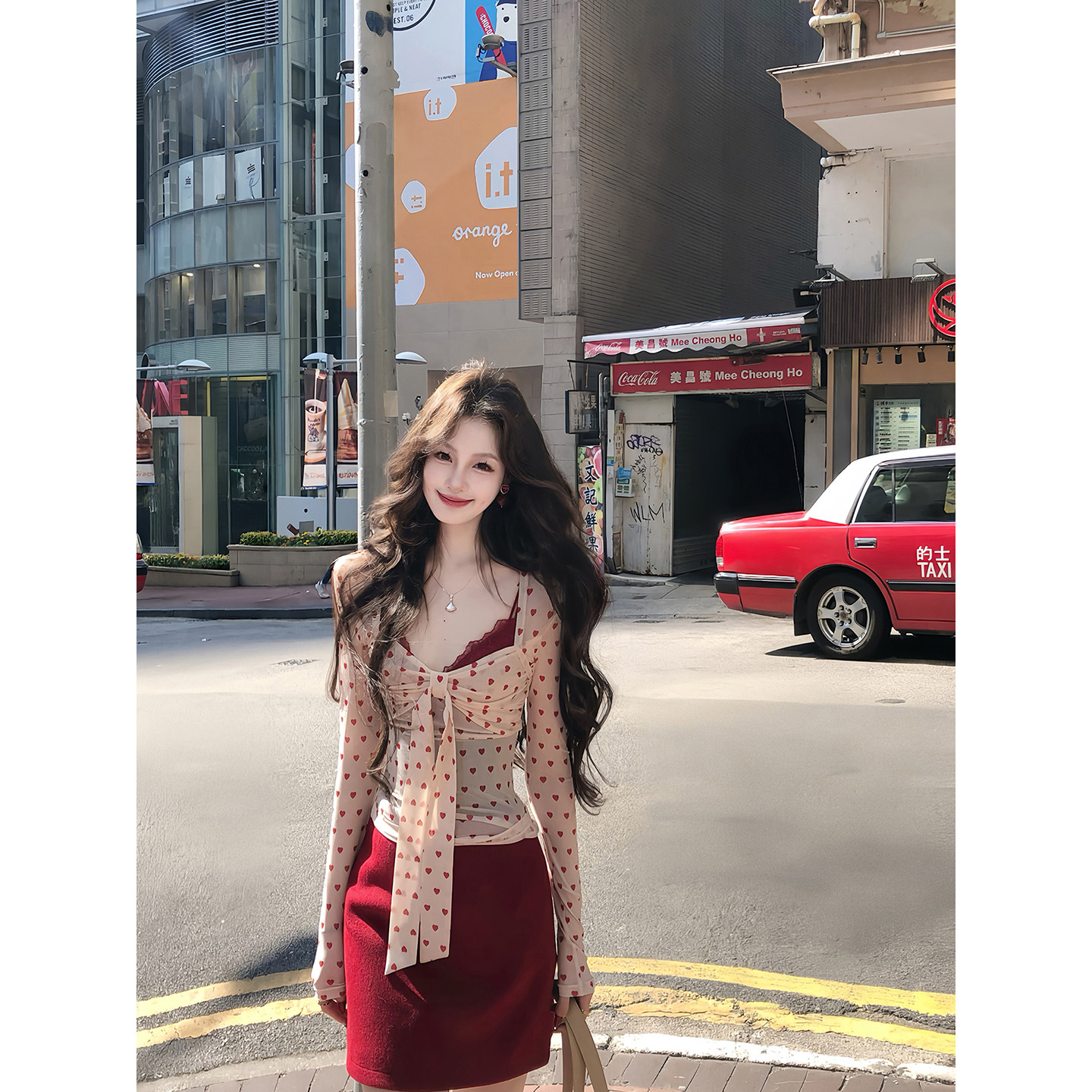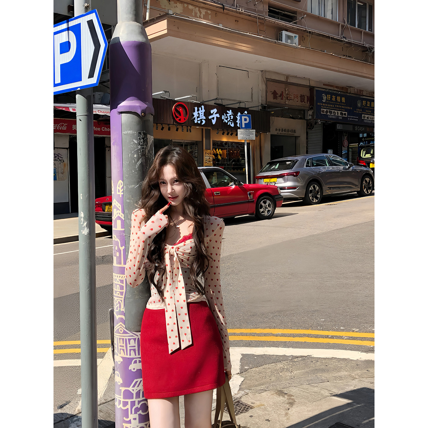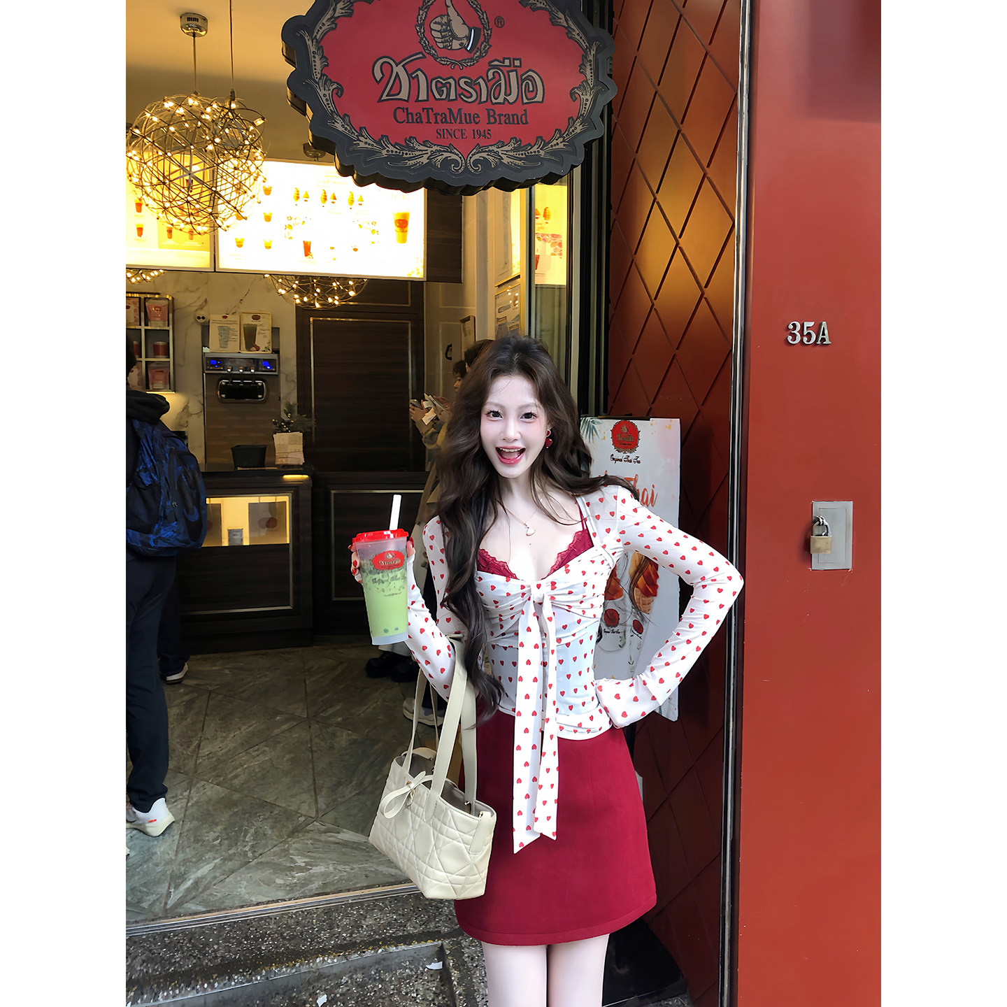 t短裙套装 吃绿色菜 甜美风爱心波点蝴蝶结绑带长袖 法式 甜莉薇