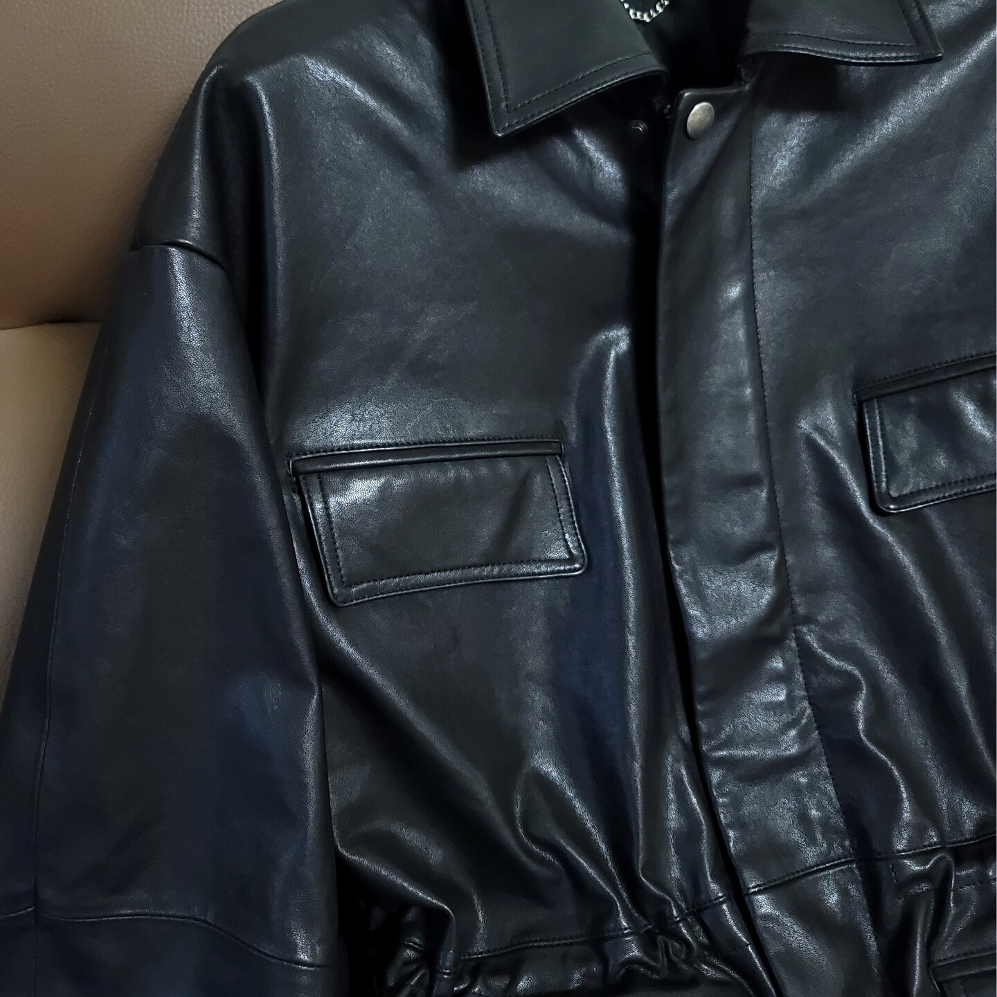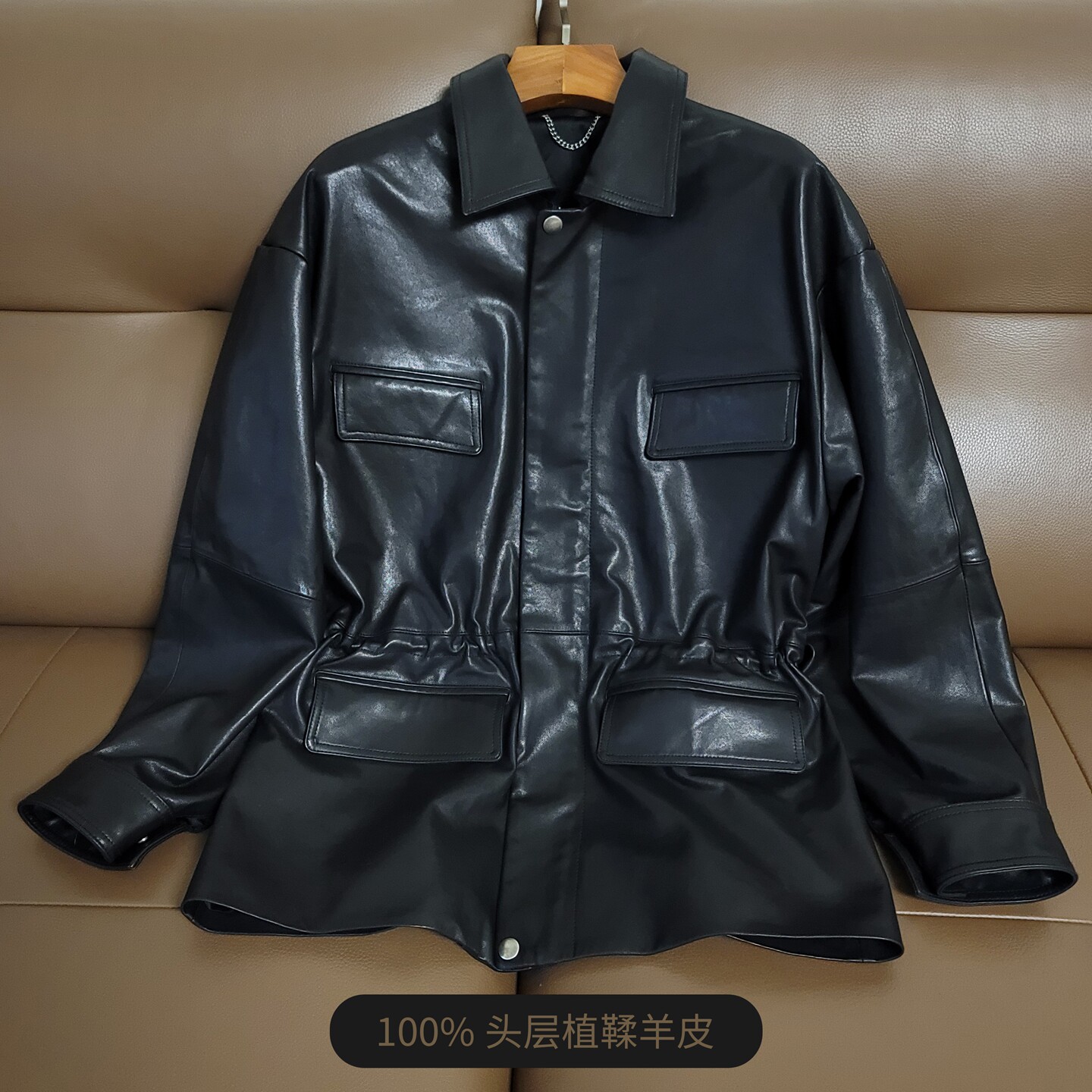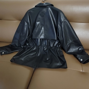 欧美植鞣头层绵羊皮廓形女士皮衣小翻领收腰真皮工装 夹克落肩外套
