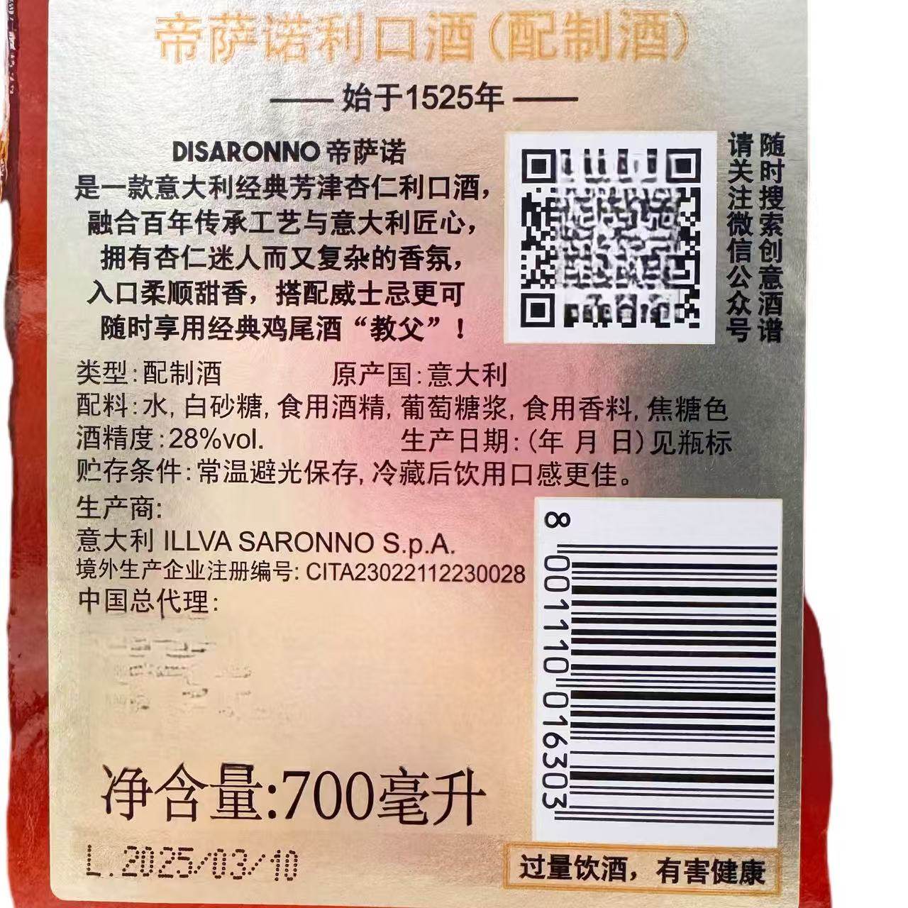 700ml Liqueur 28度 国行 帝萨诺利口酒力娇酒 正品 Disaronno
