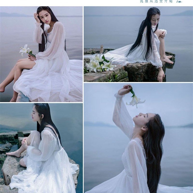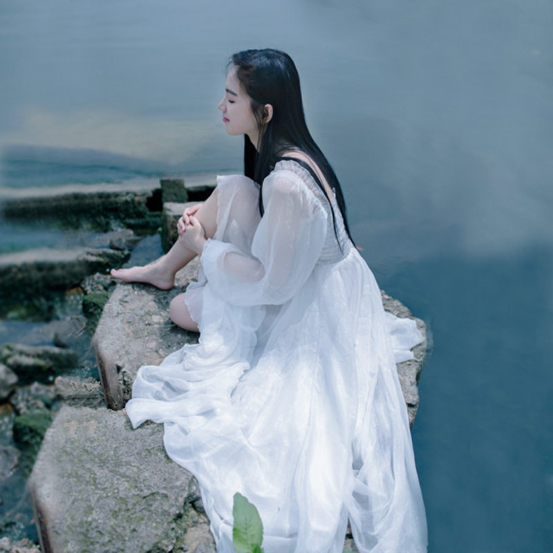 波西米亚白色仙女风长裙森女灯笼袖 大裙摆连衣裙雪纺甜美 透气长款