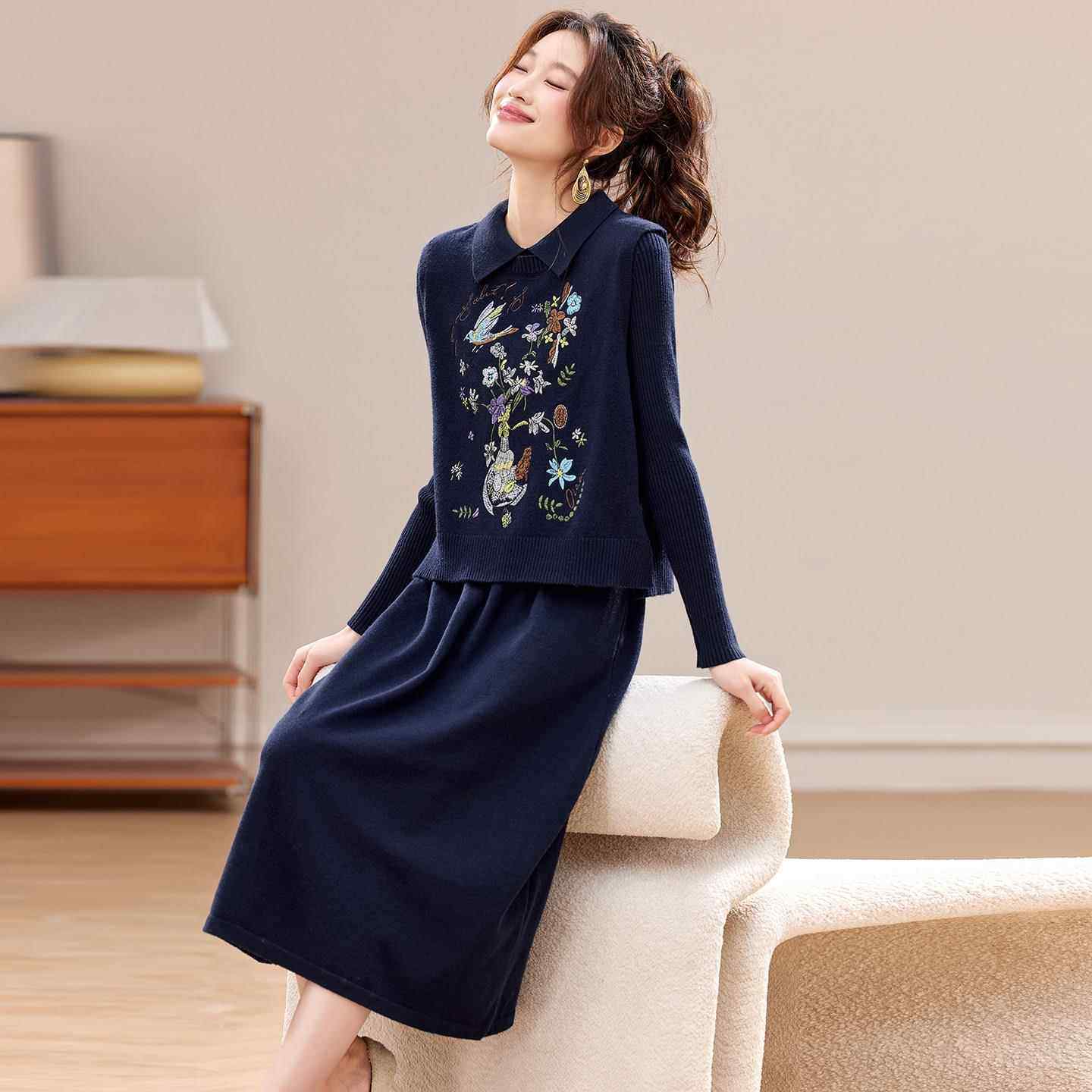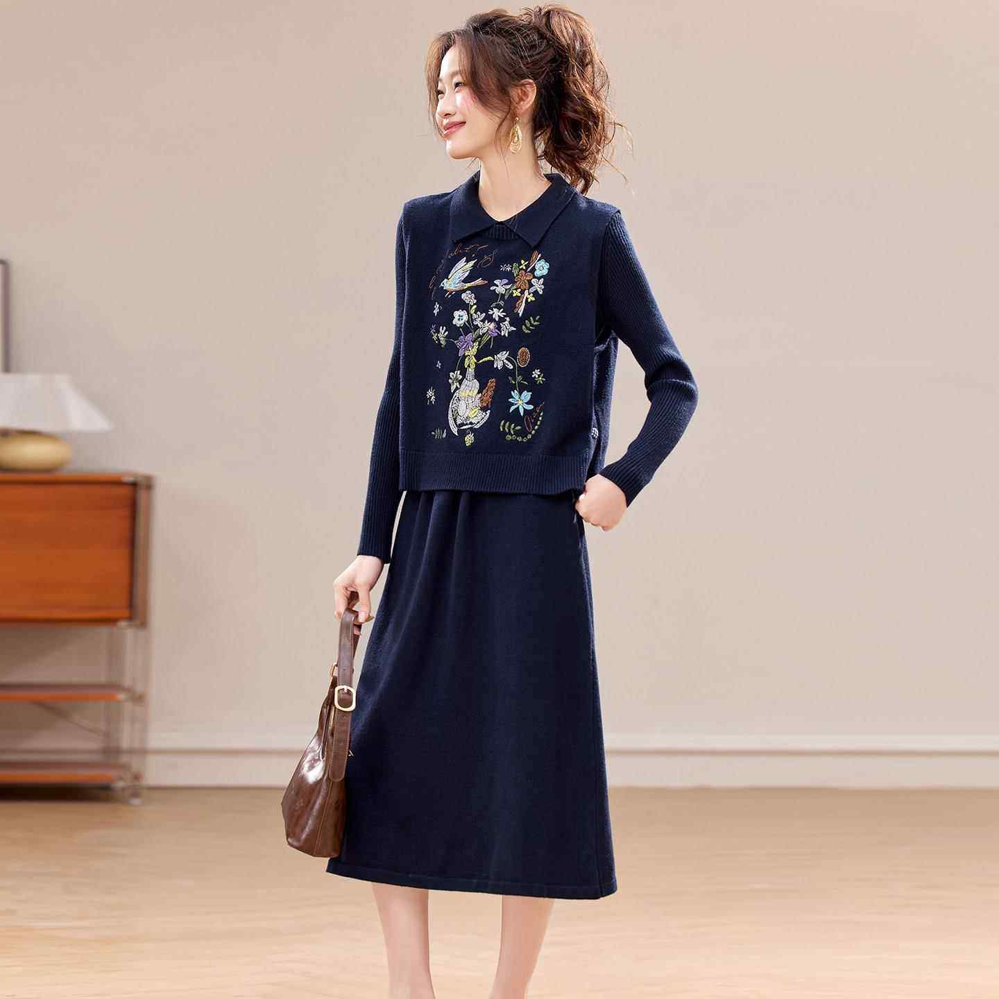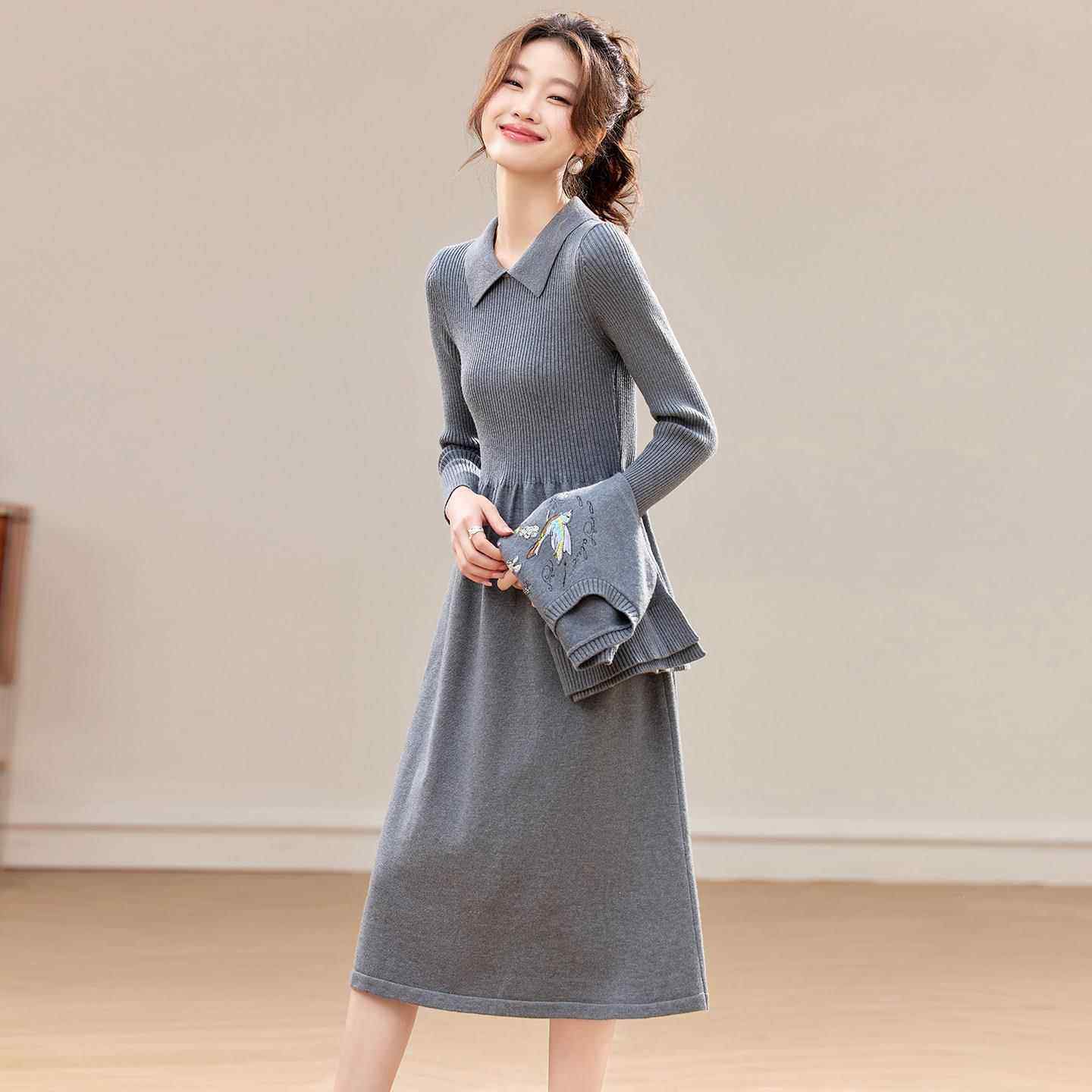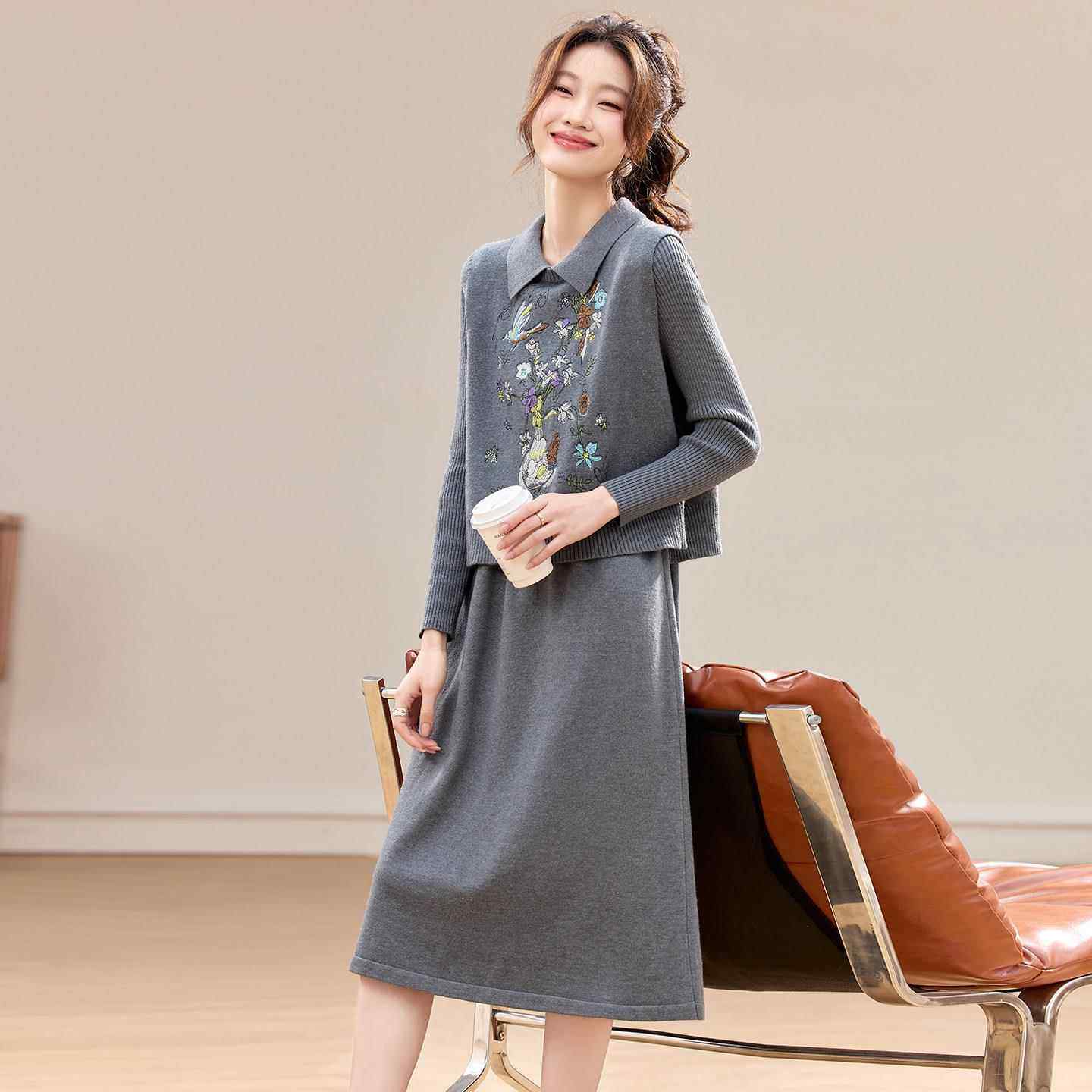 两件套裙子 刺绣翻领显瘦中长款 灰色针织连衣裙套装 女2025秋冬新款