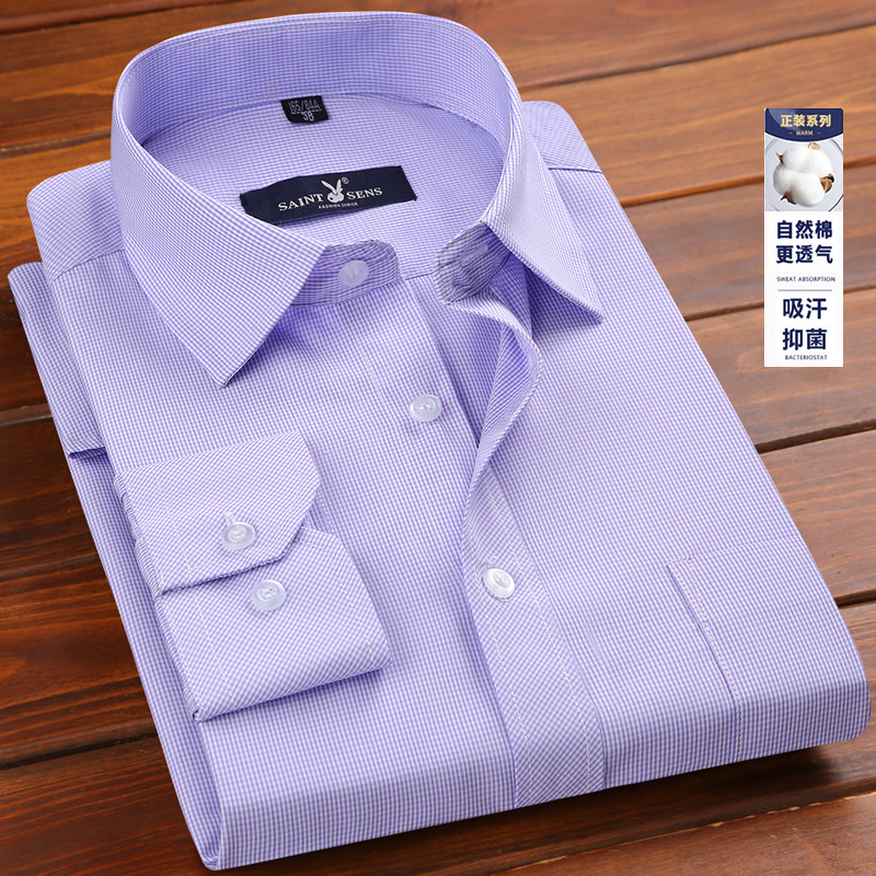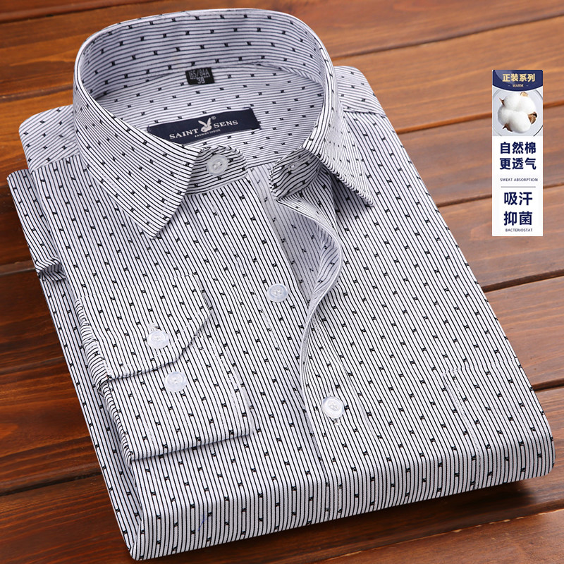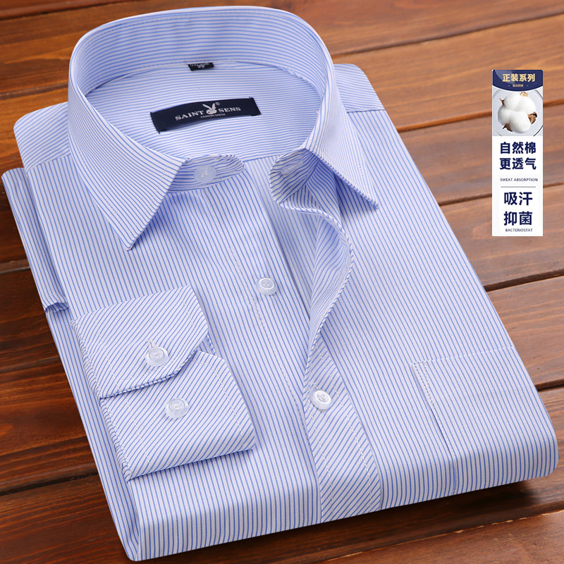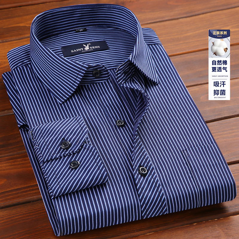 全棉条纹衬衫 男士 男长袖 中年宽松薄款 免烫衬衣夏 2019新款 爸爸春装