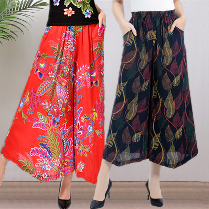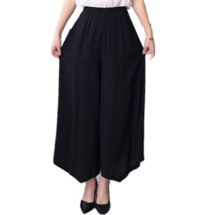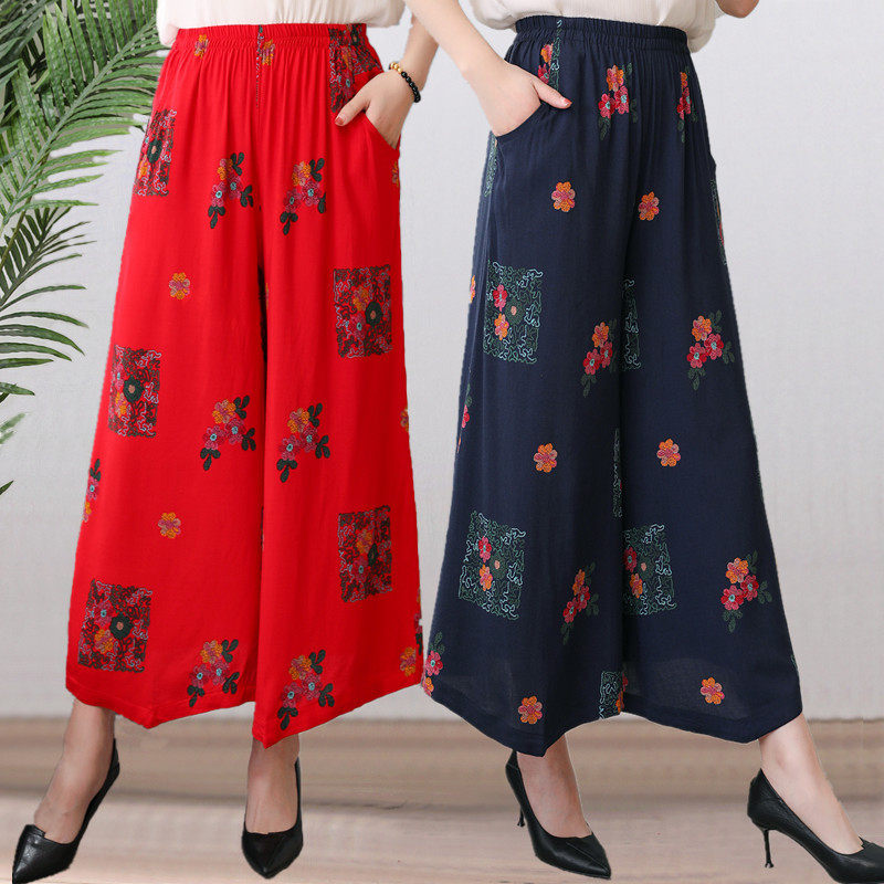 春夏款 人造棉阔腿裤 民族风九分裤 中老年女裤 宽松高腰棉绸纯色裙裤