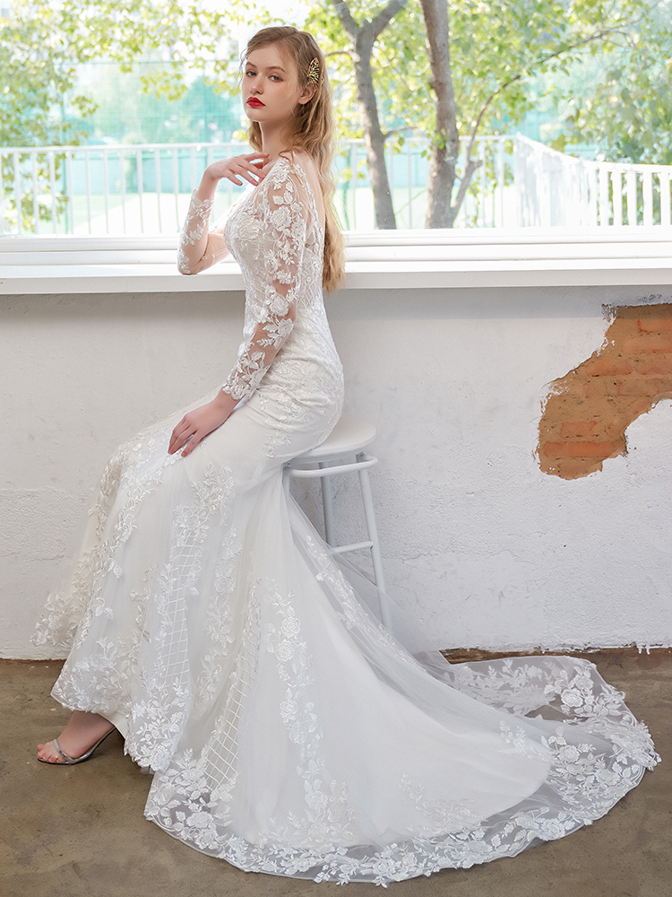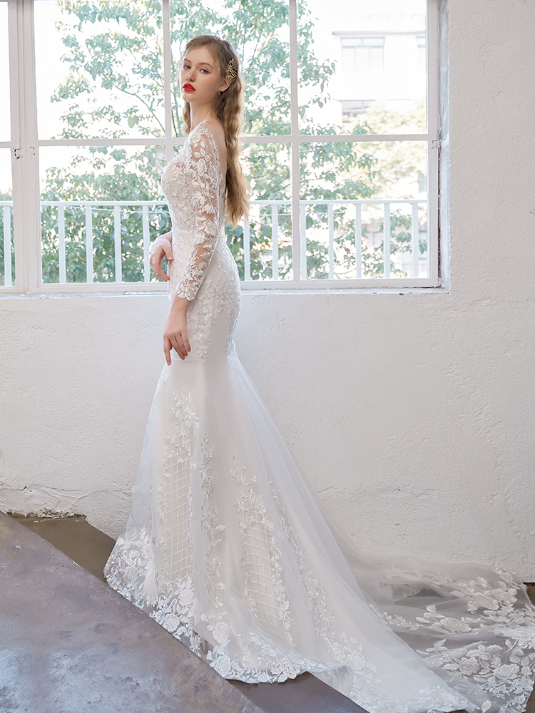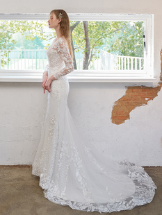 法式 新娘超仙晨袍结婚迎宾出门轻婚纱简约晚礼服裙 白色一字肩长袖