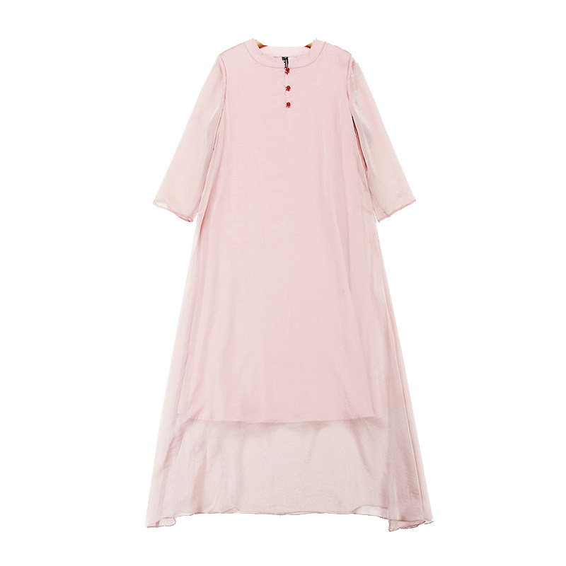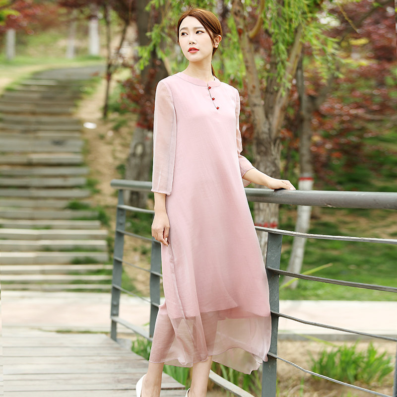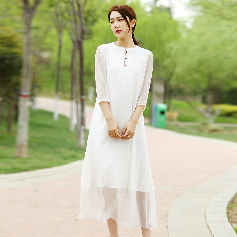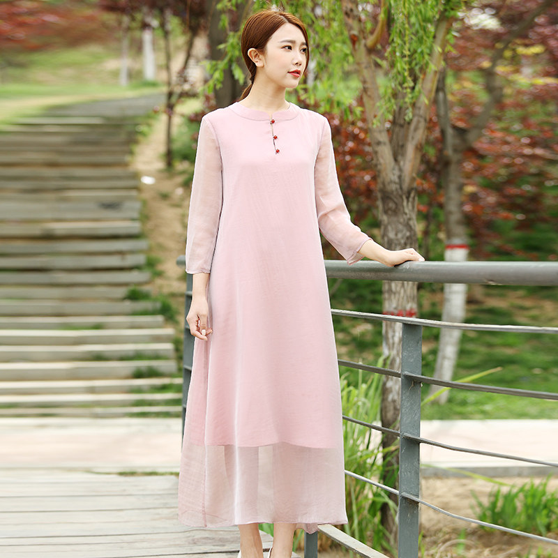 宽松显瘦中袖 复古文艺民族风纯色雪纺连衣裙女装 长裙 新款 2020夏季