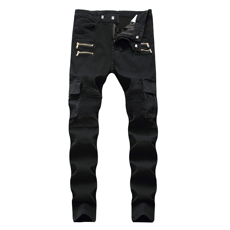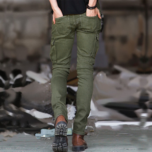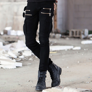裤 工装 弹力高街多口袋拉链机车修身 欧美潮男BIKER褶皱小脚休闲裤