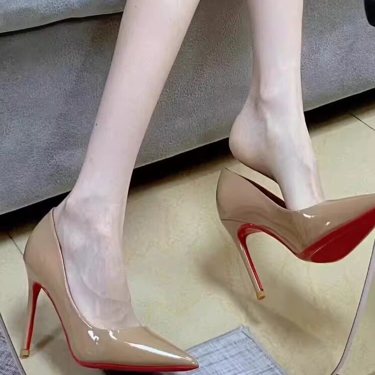 红底漆皮尖头性感裸色工作单鞋 大码 女细跟2025春秋新款 黑色高跟鞋