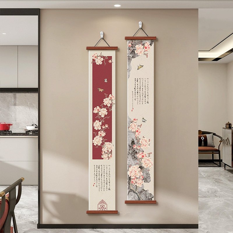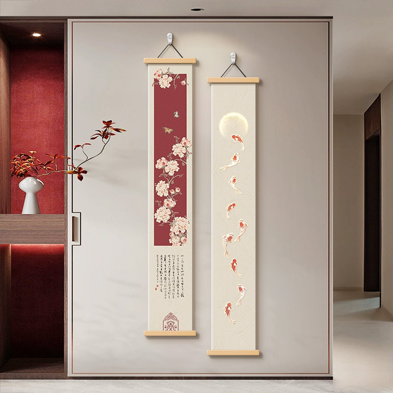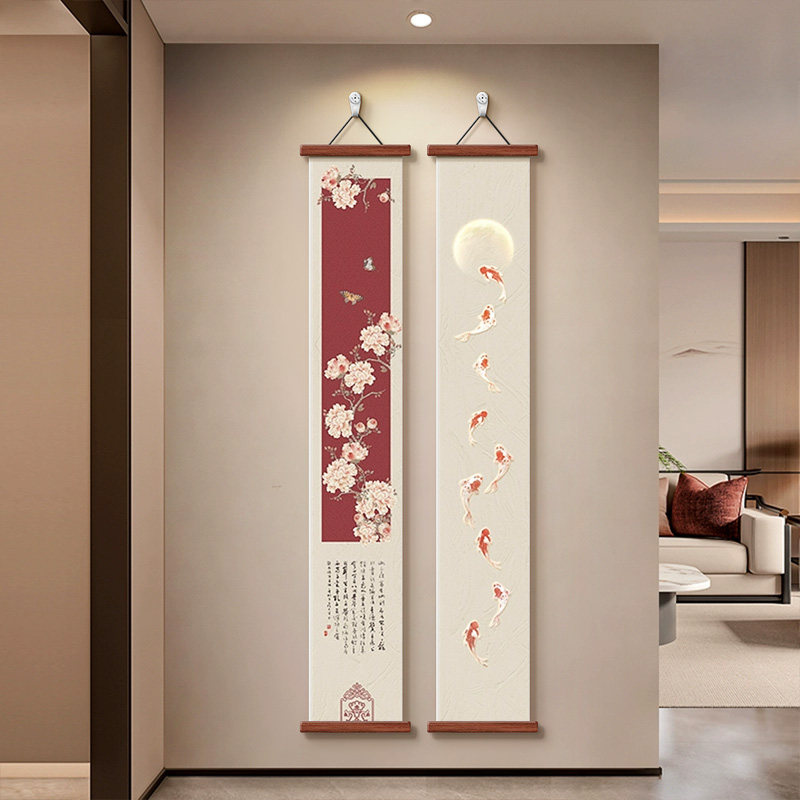 窄长条寓意好双联壁画 走廊尽头挂画竖版 牡丹九鱼玄关装 饰画新中式