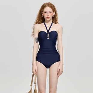 澳洲高贵深蓝色连体性感比基尼小胸聚拢遮肚显瘦温泉度假泳衣女