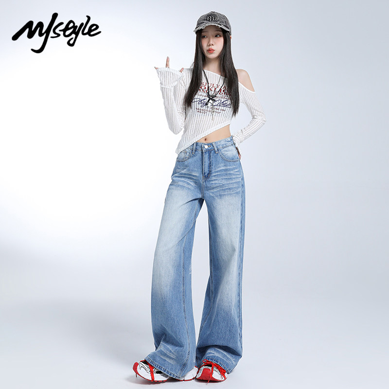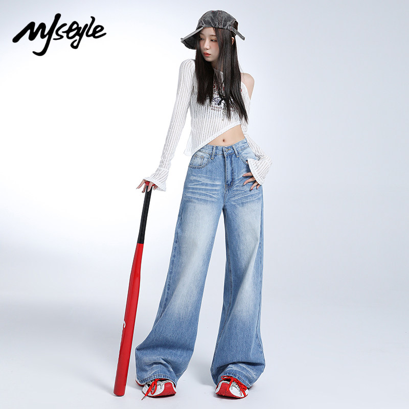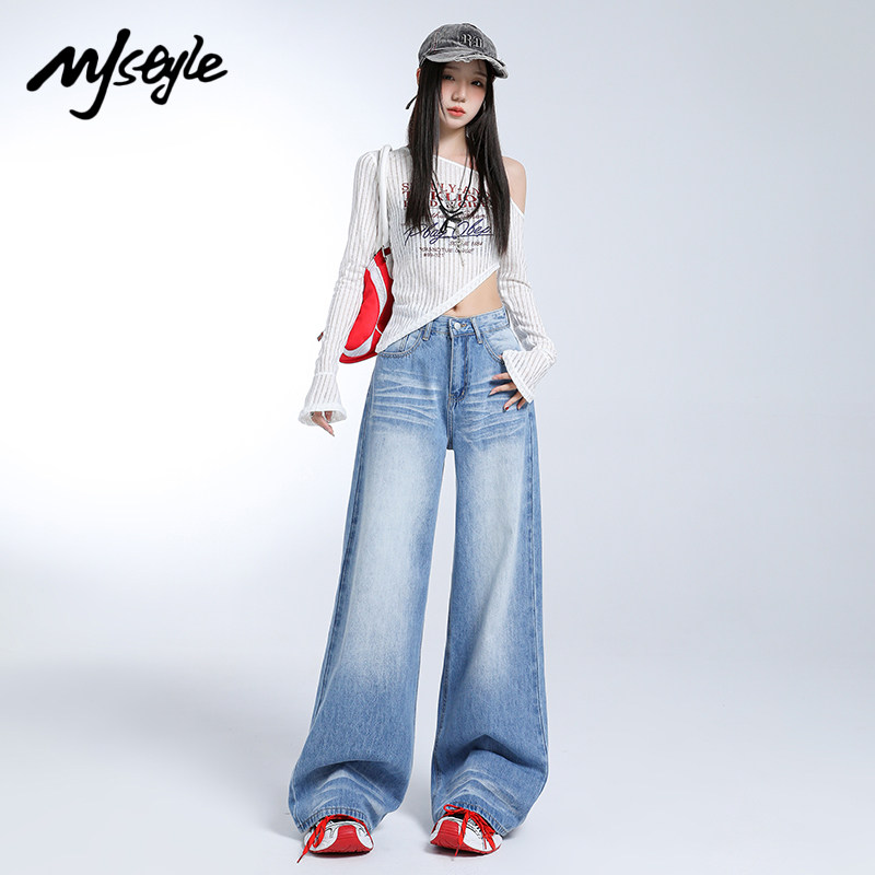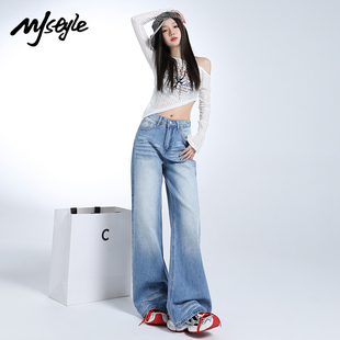 小个子高腰显瘦阔腿长裤 新款 子 女2025秋季 慕兔港风复古水洗牛仔裤