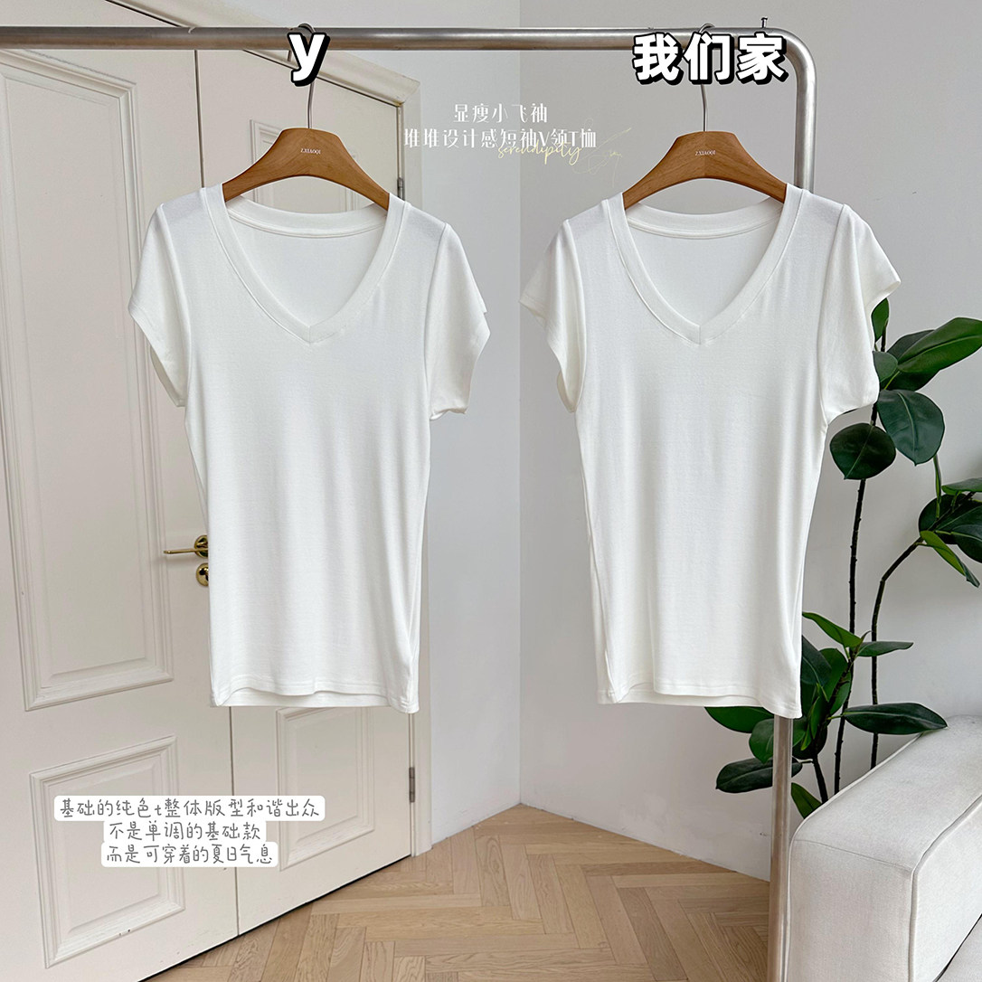 堆堆设计感短袖 柒月末2026年夏季 显瘦小飞袖 修身 V领纯色T恤女 新款