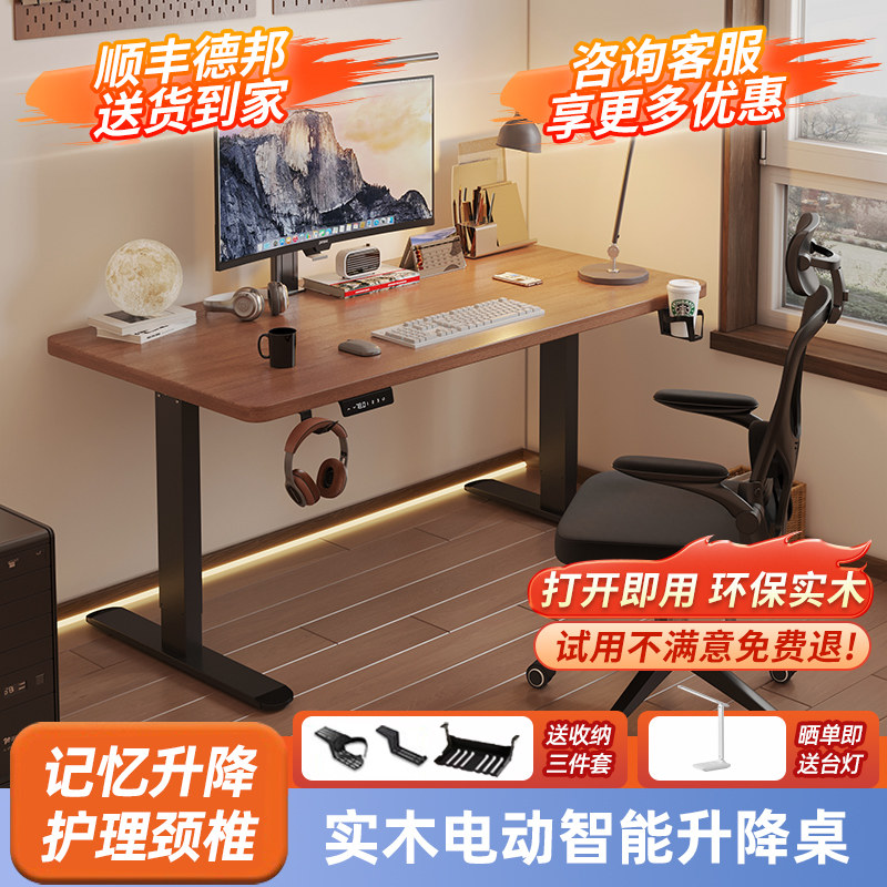 三梦实木电动升降桌家用电脑桌可升降电竞桌子学习办公书桌工作台