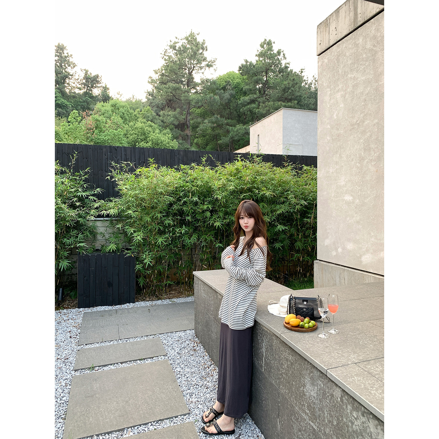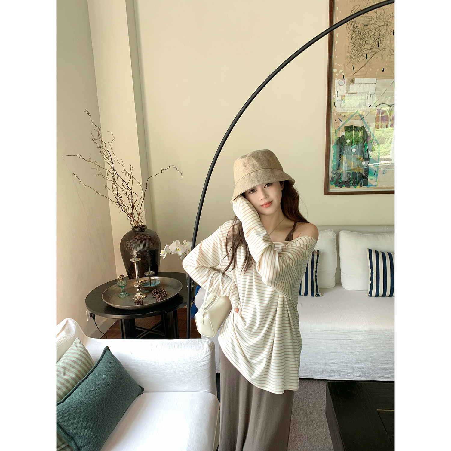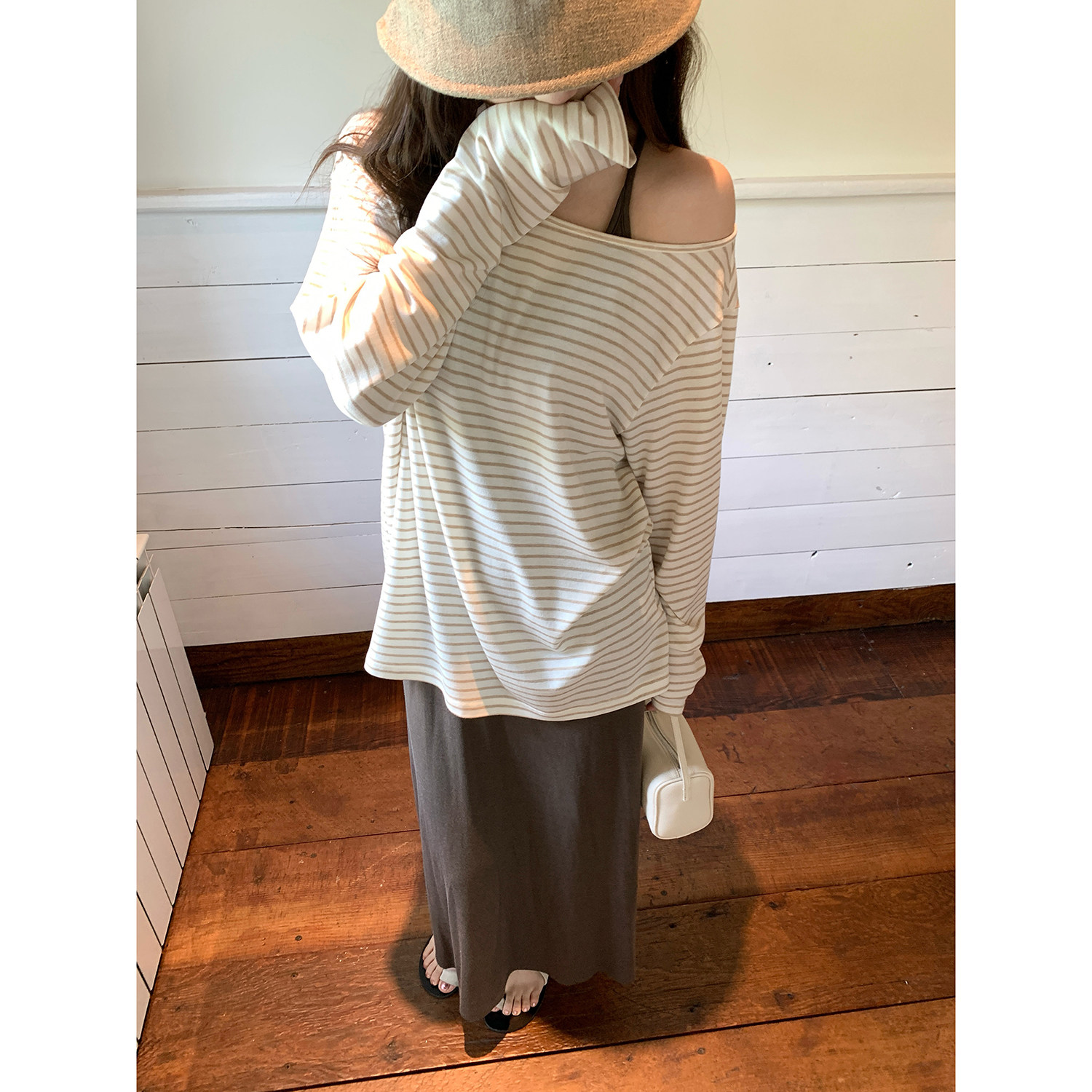 T新品 现货AHY 莱赛尔羊毛爽滑亲肤宽松圆领条纹长袖