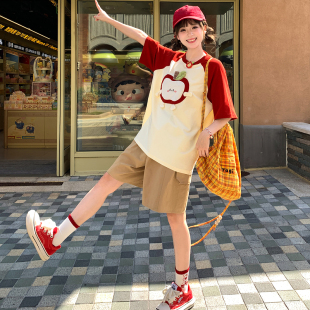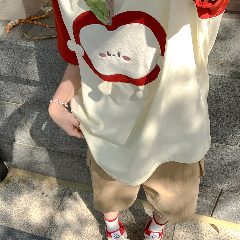 森女部落原创可爱卡通苹果红白拼色显白宽松上衣休闲日常T恤女夏