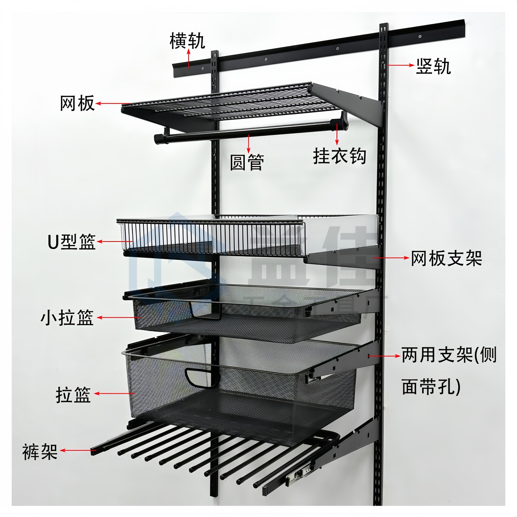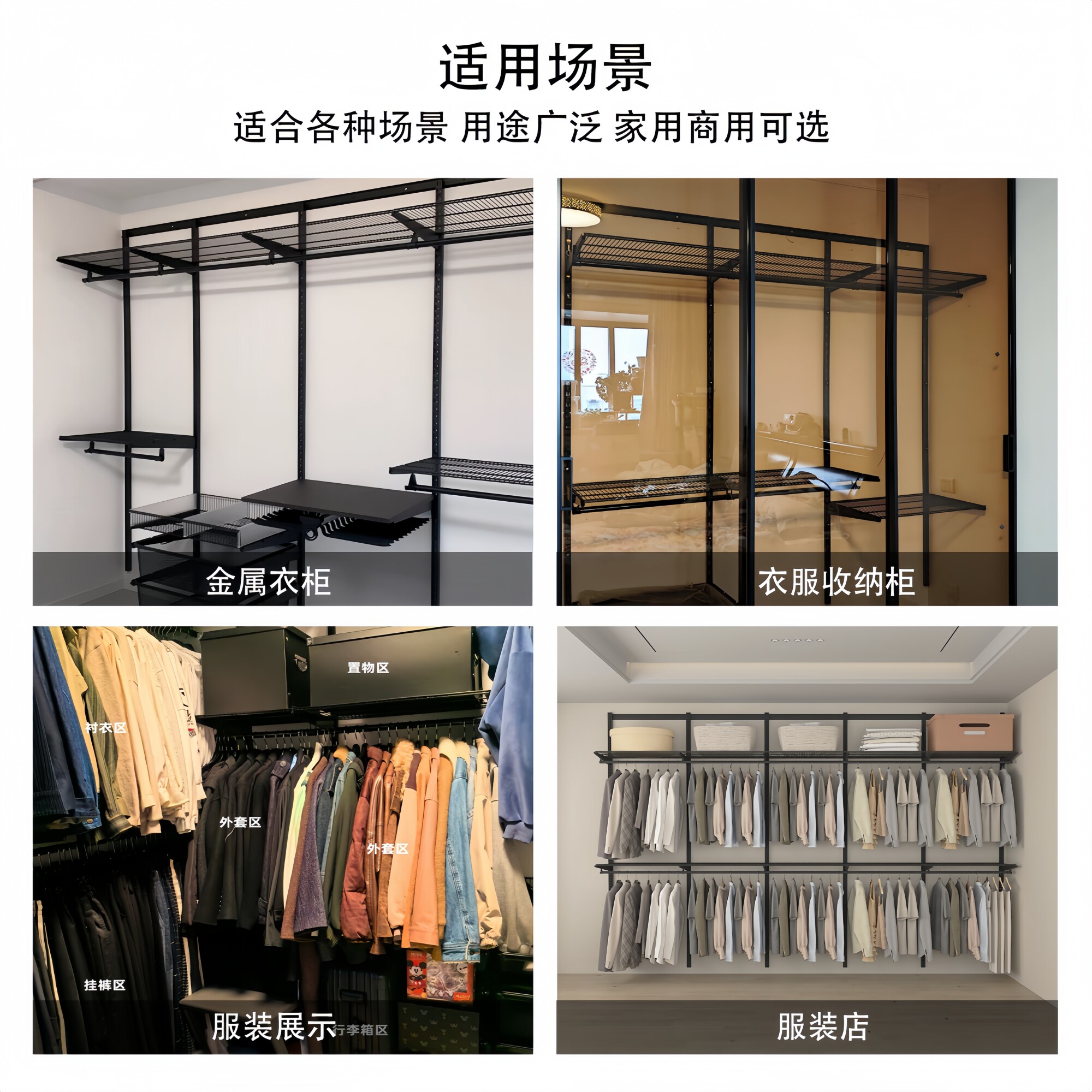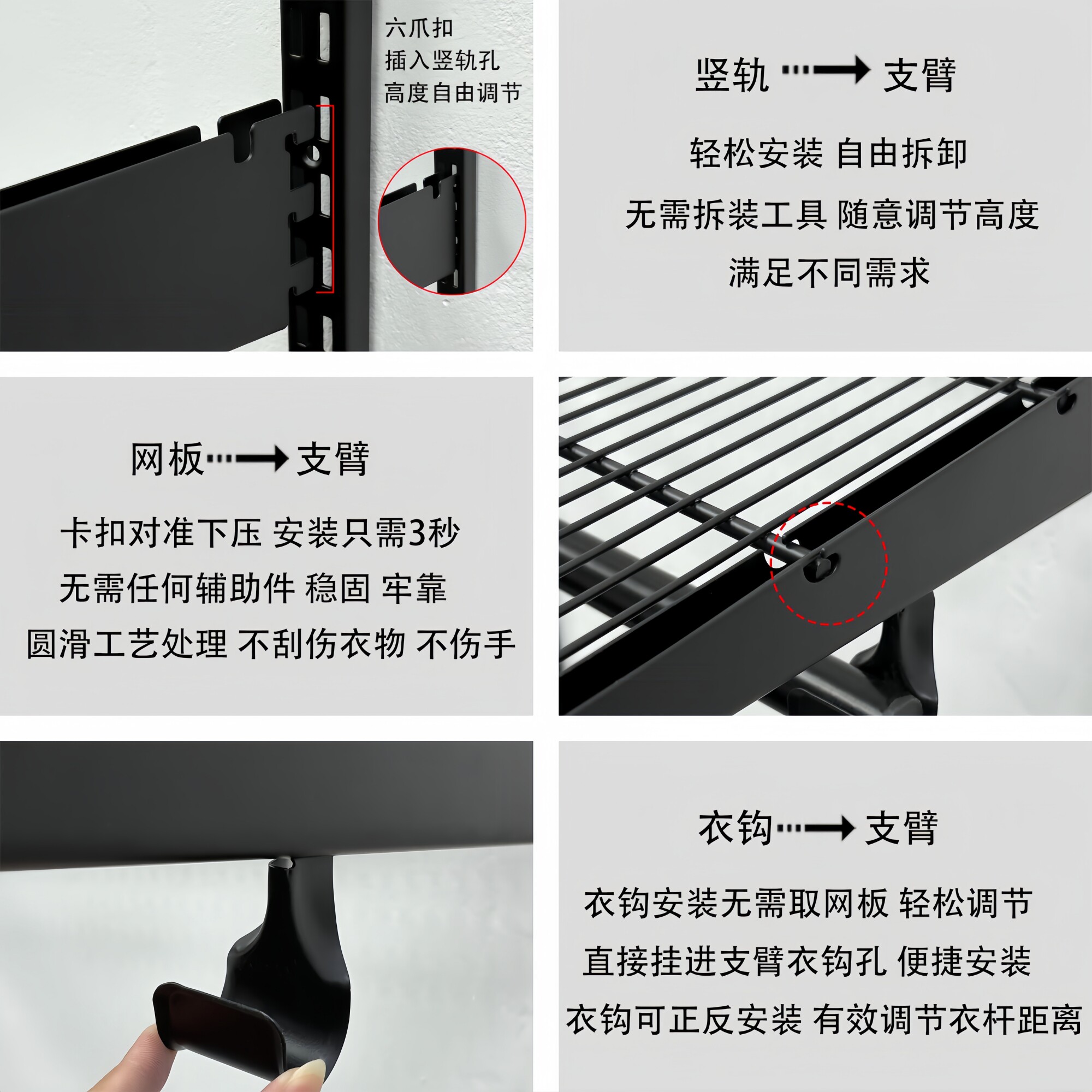 黑色开放式 衣架 金属衣柜AA柱砌墙衣橱挂杆收纳网格板网篮壁挂式