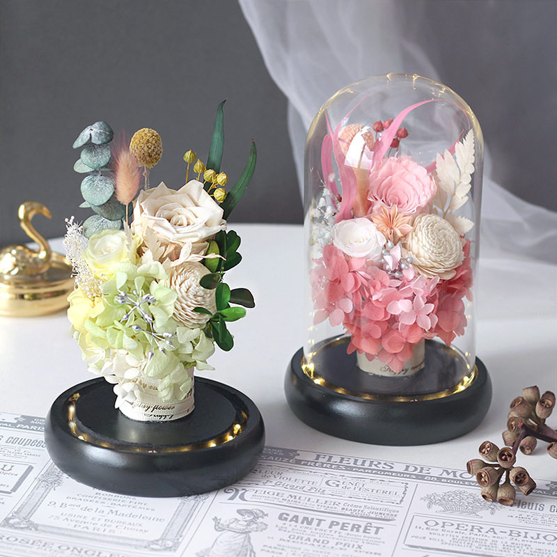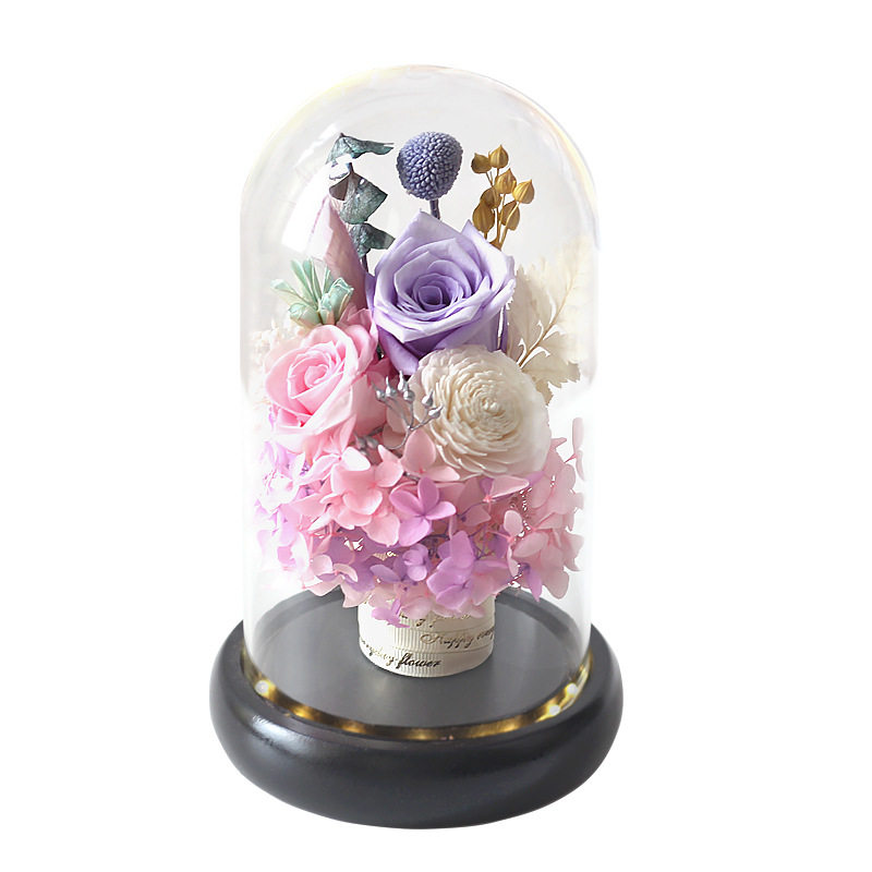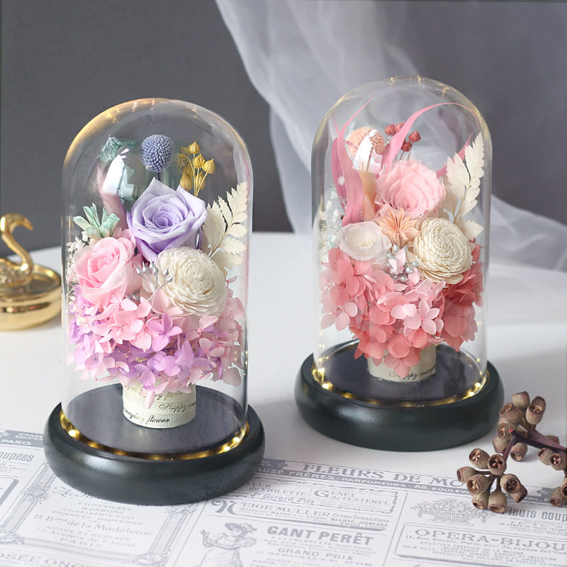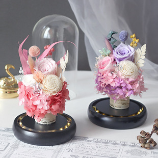永生花玫瑰玻璃罩摆件礼盒发光保鲜花成品带灯情人节礼物创意礼品
