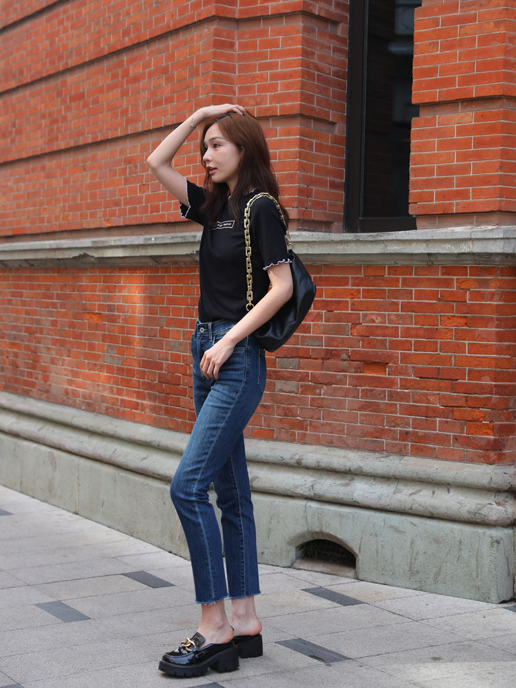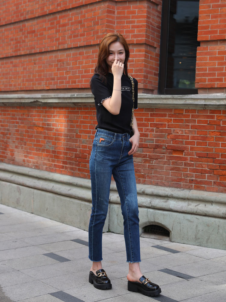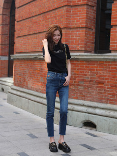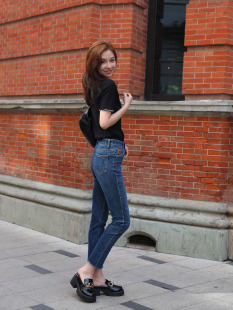 女mini 九分裤 brand新款 窄脚裤 显瘦小直筒烟管裤 高腰深蓝色牛仔裤