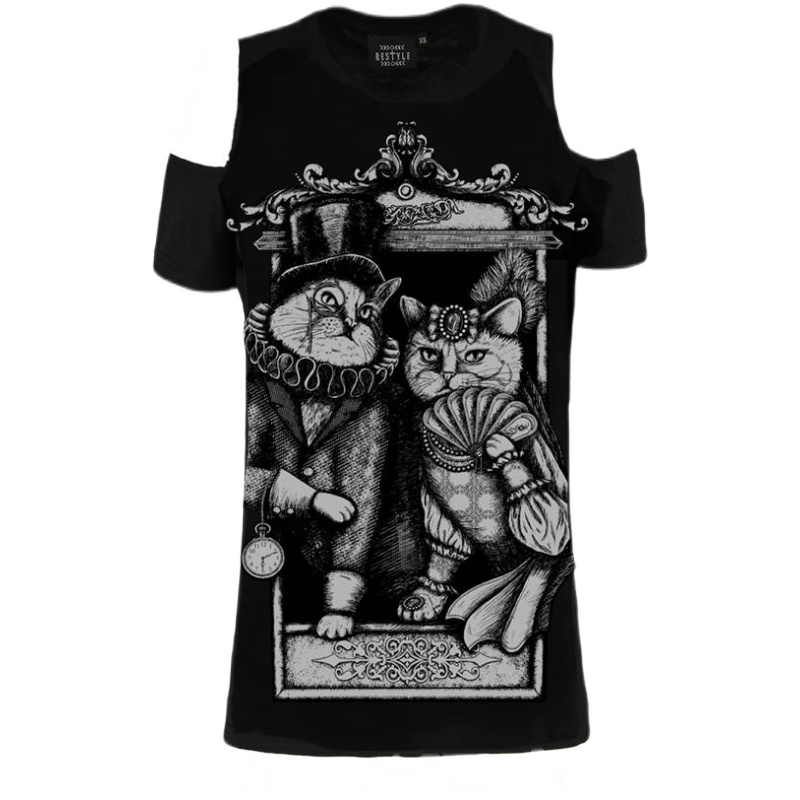 东欧波兰RESTYLE暗黑哥特猫Couple蒸汽朋克猫夫妇露肩短袖 T恤