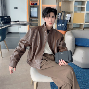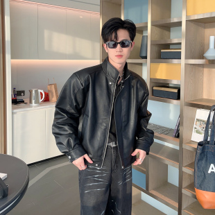 春秋短款 宽松立领垫肩机车风PU皮夹克 痞帅高级感黑色皮衣外套男款