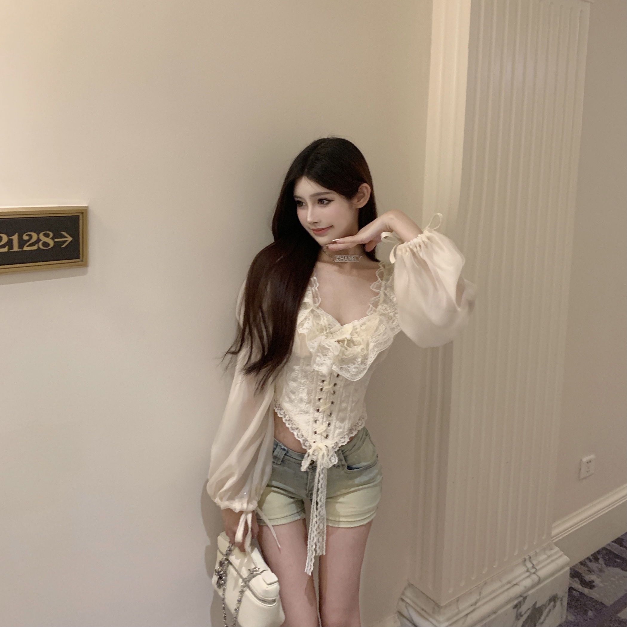 宫廷风绑带鱼骨衬衫 新款 女春装 蕾丝小衫 上衣 气质甜美减龄短款 法式