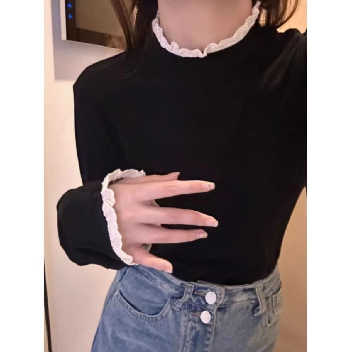 长袖 修身 T恤设计感花边上衣服 女内搭春秋冬2025新款 半高领打底衫