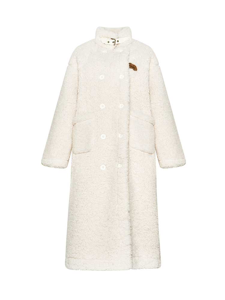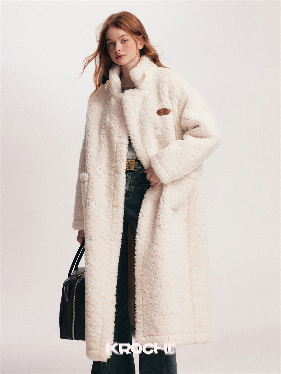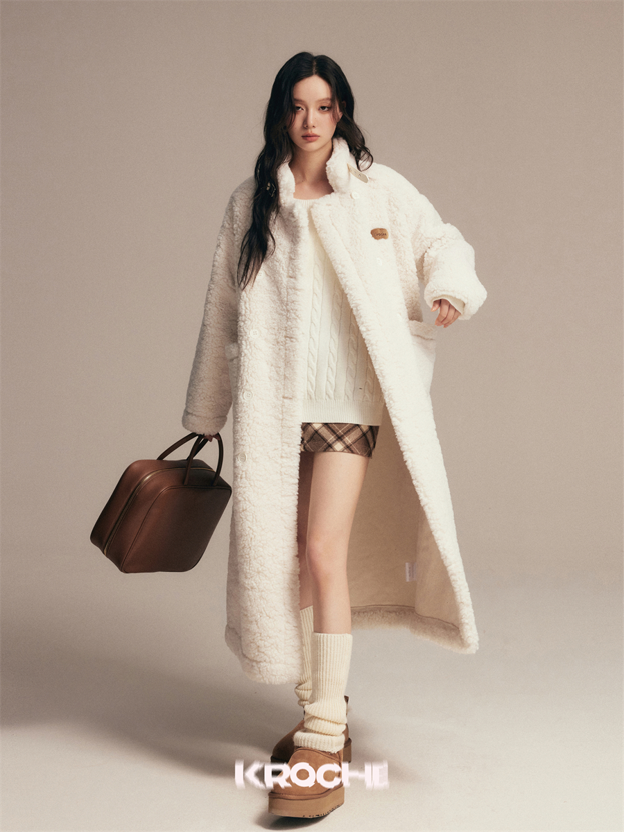 过膝大衣毛呢外套 加厚翻领羊羔绒白色长款 赵今麦孙怡同款 Kroche