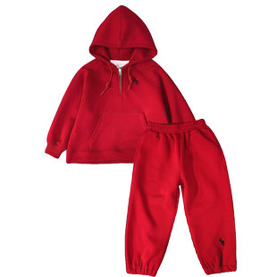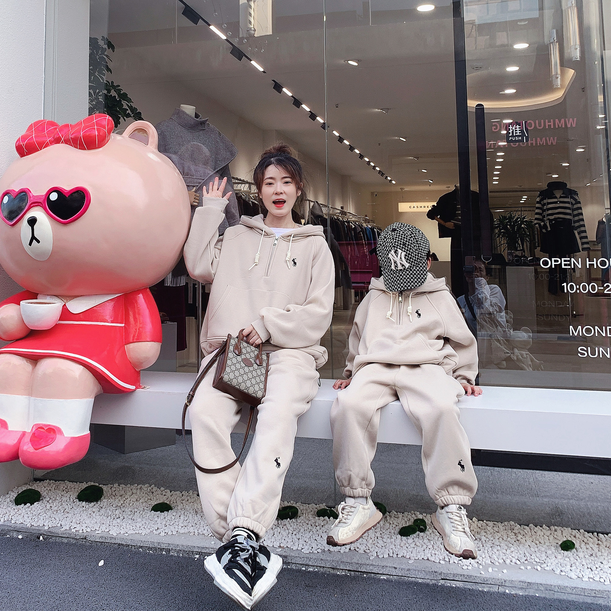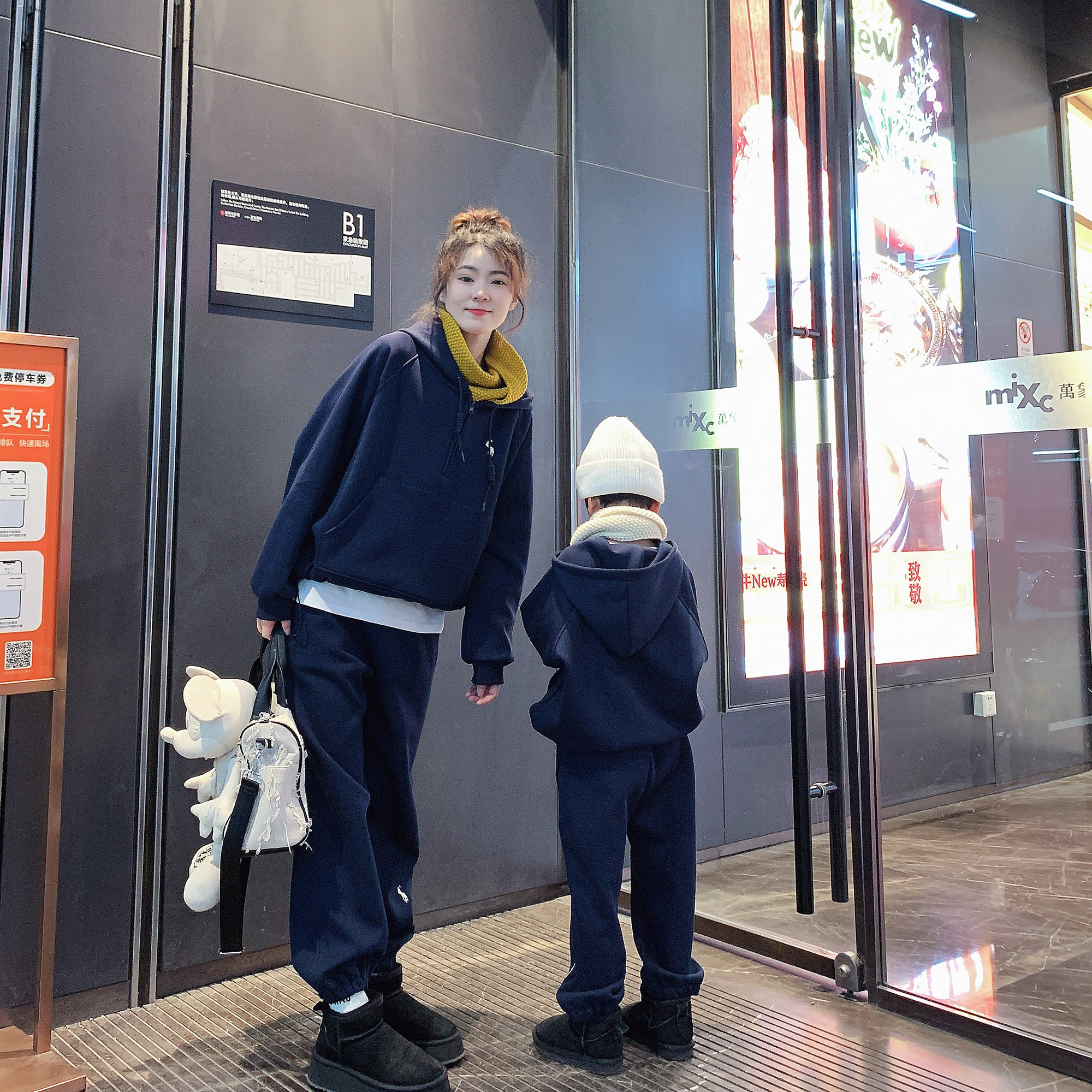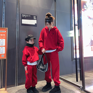 母女母子时尚 一家三口酒红色运动套装 连帽卫衣 亲子装 2025春秋新款