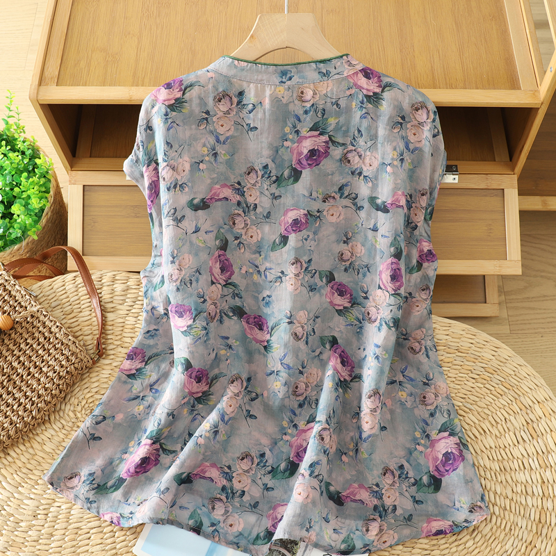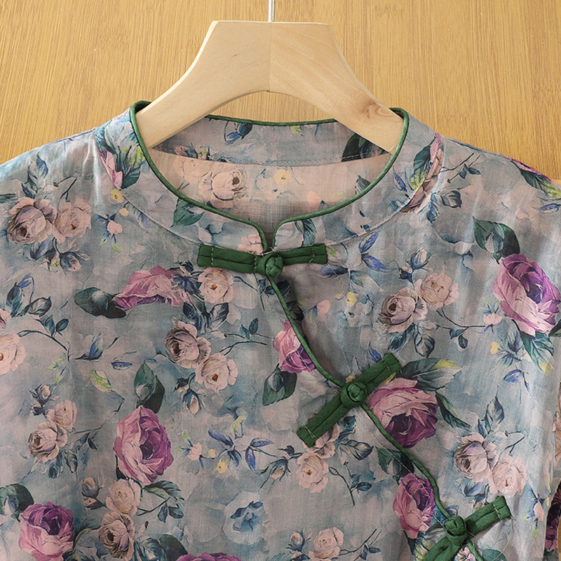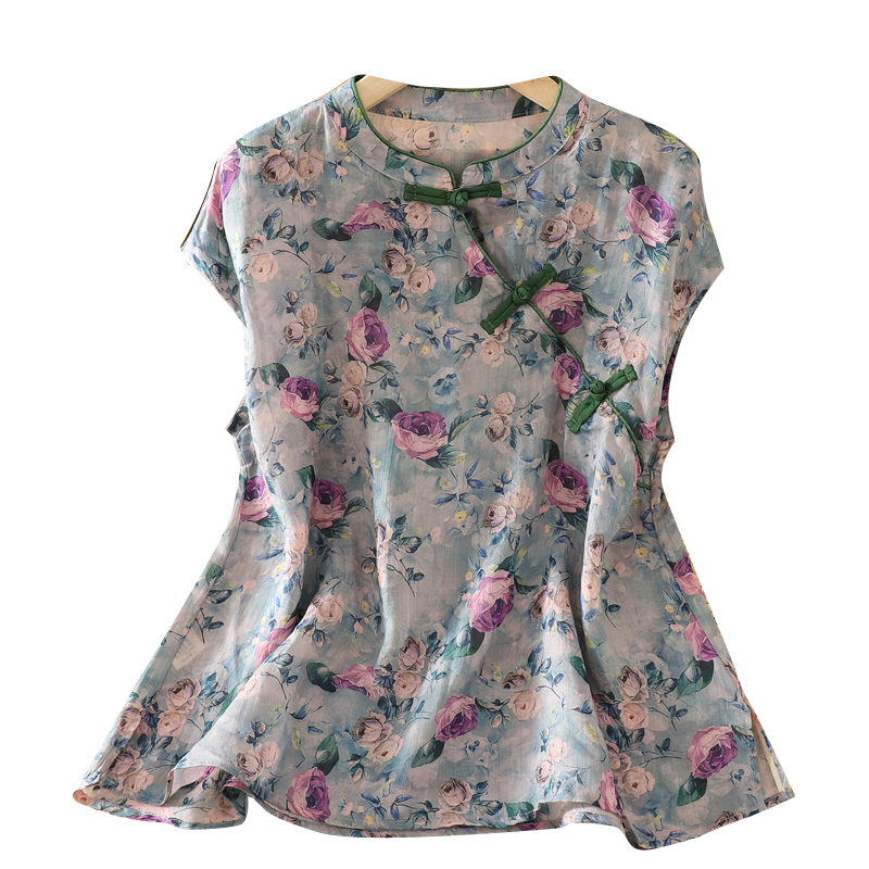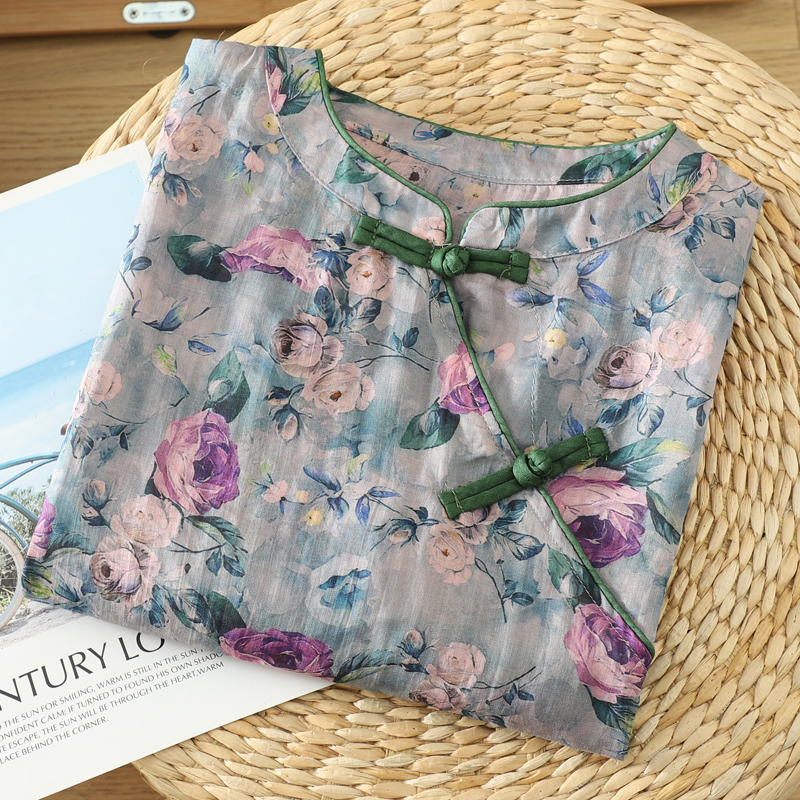 薄款 偏薄夏季 小衫 棉麻复古百搭斜襟盘扣上衣T恤衫 花色休闲 新款