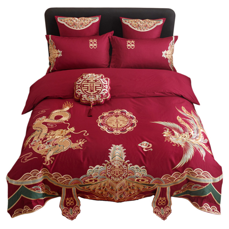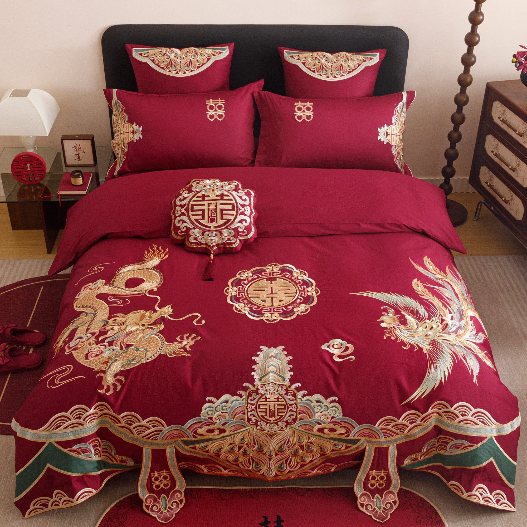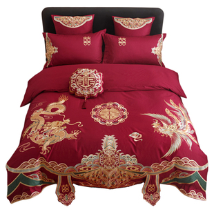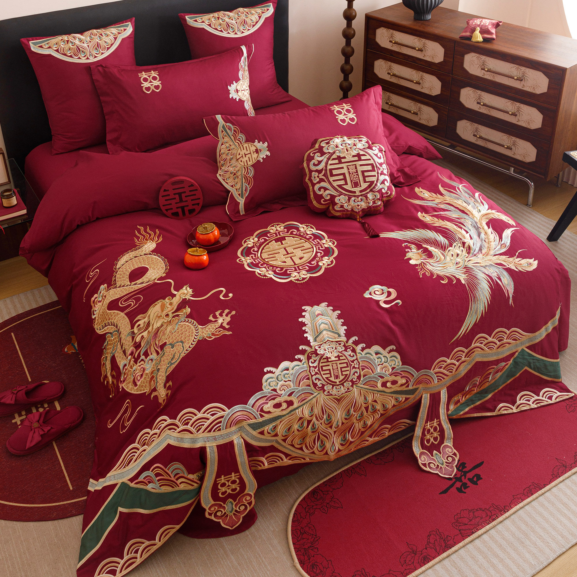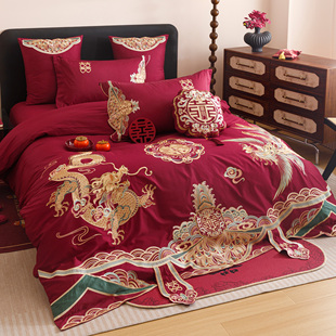 传统中式 婚庆龙凤重工刺绣四件套全棉红色结婚房被套纯棉床单床品