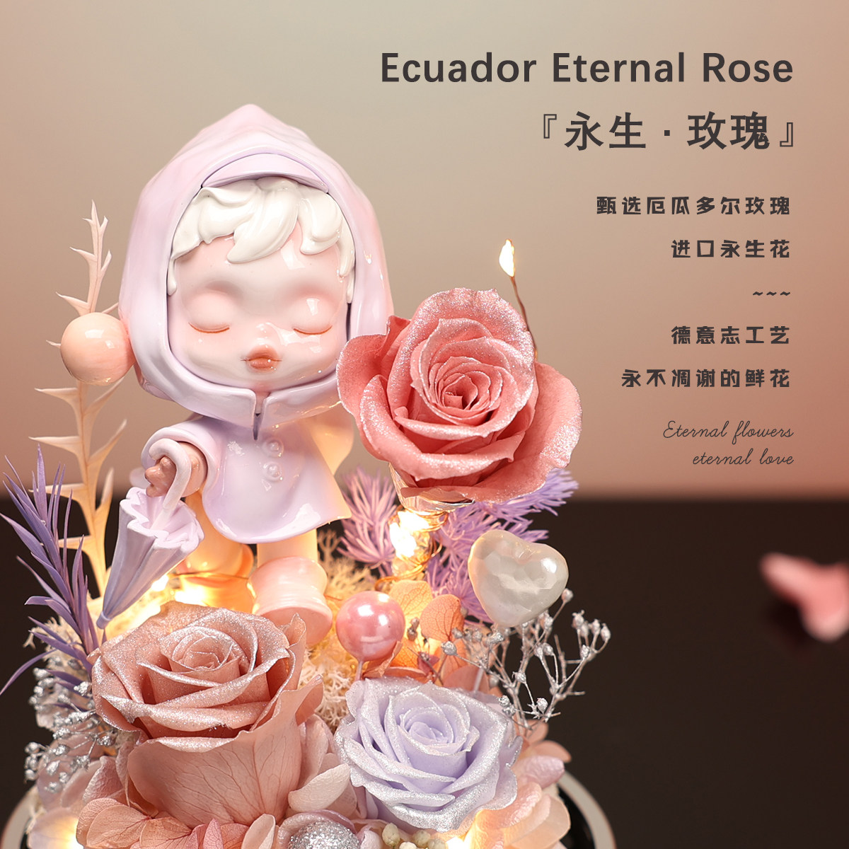 铃兰花永生花圣诞树玻璃罩玫瑰花积木手办盲盒人偶带灯发光防尘罩