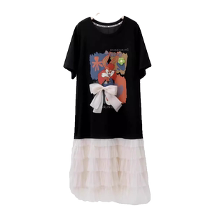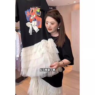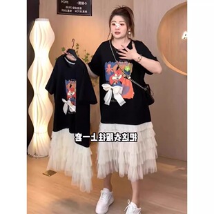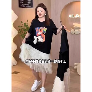 拼接荷叶边裙子 千金风撞色网纱连衣裙女微胖大码 安妮不火 重磅款