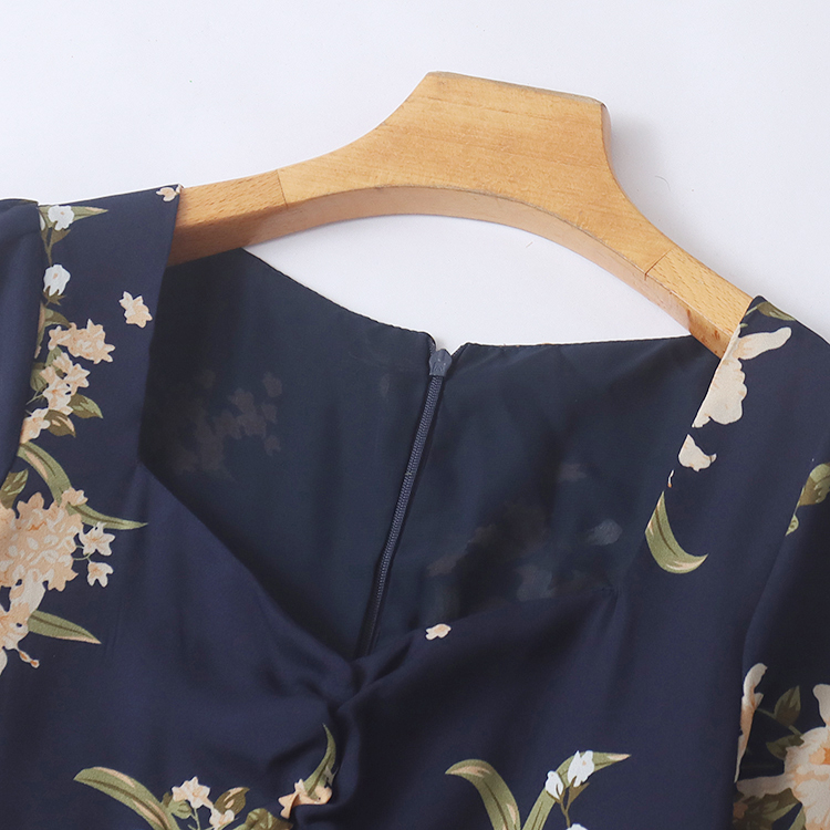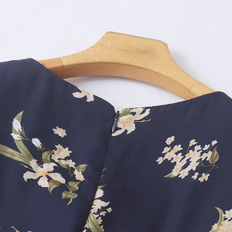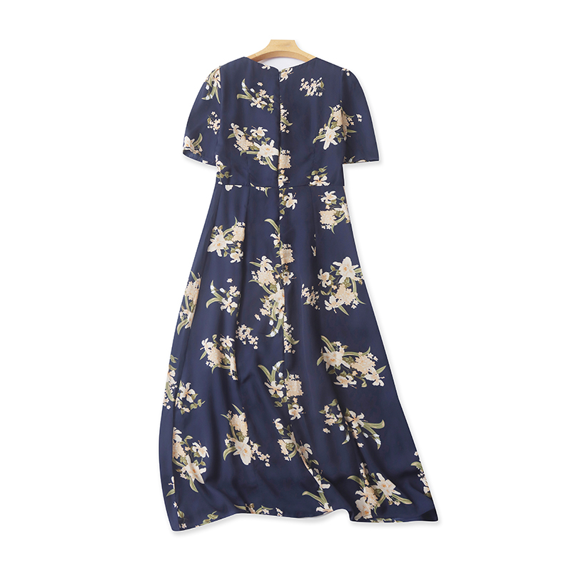 雪纺V领碎花连衣裙 收腰A字长款 夏季 短袖 女套头裙子09542 新款 法式
