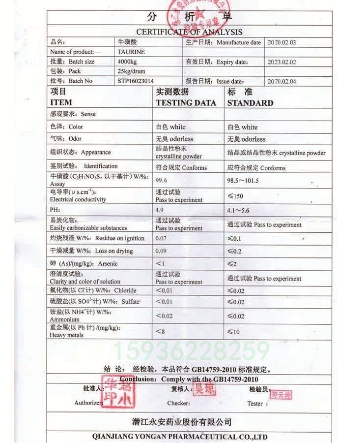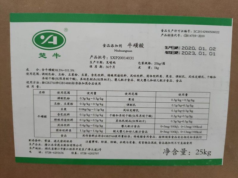 高纯度永安药业纯牛磺酸粉1斤固体饮料人用健身猫咪用护眼食品级