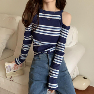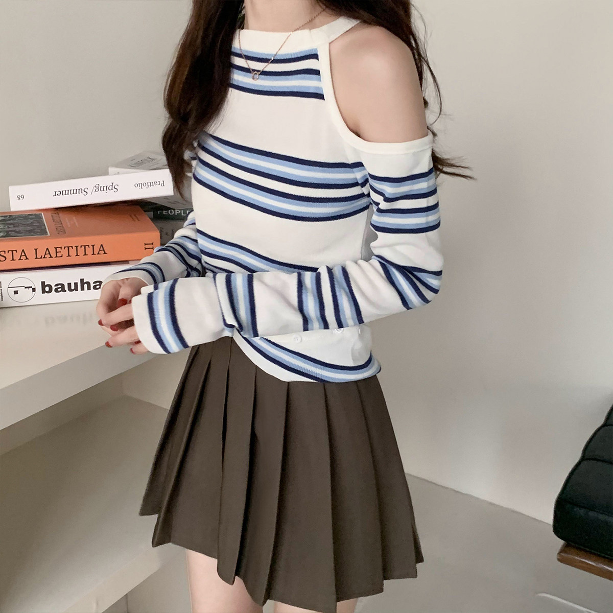 挂脖露肩设计条纹长袖 显瘦短款 针织衫 修身 上衣 女早秋2021新款 秋季