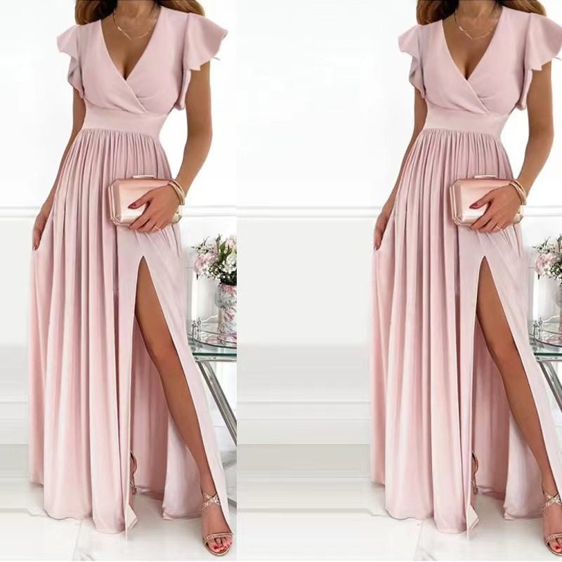 白里奶杏慕斯 V领皱褶温柔收腰长裙甜美风宽松显瘦百搭连衣裙 新款