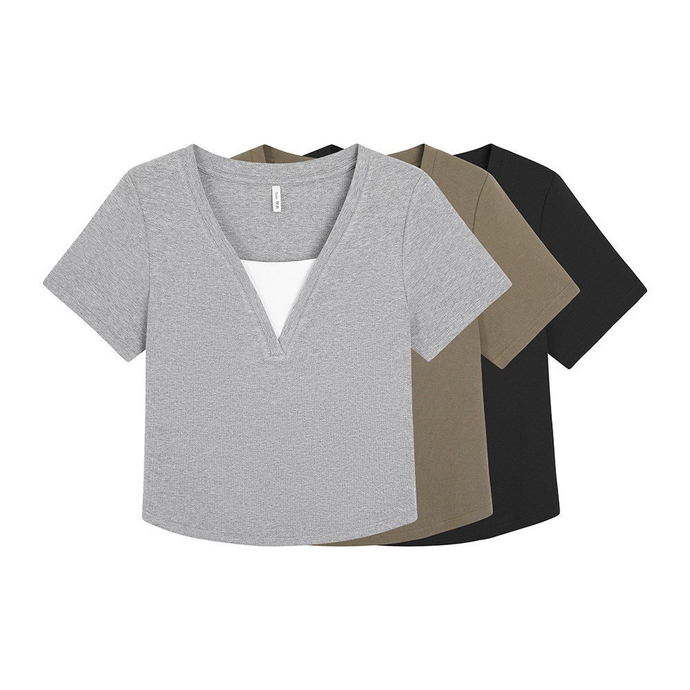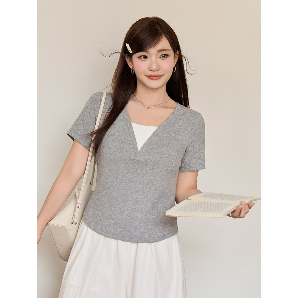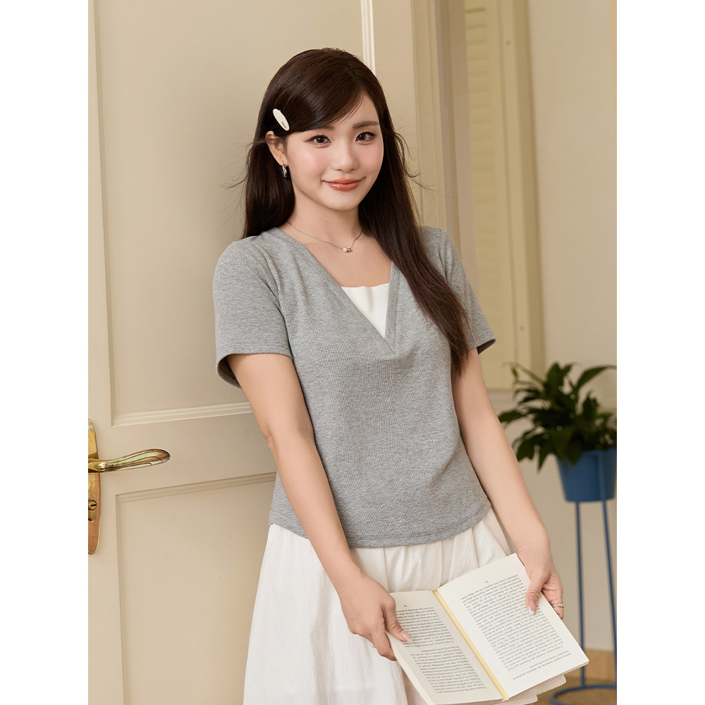 小波家2026夏季 上衣 胖mm韩系简约气质假两件正肩短袖