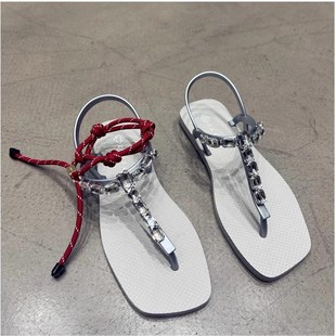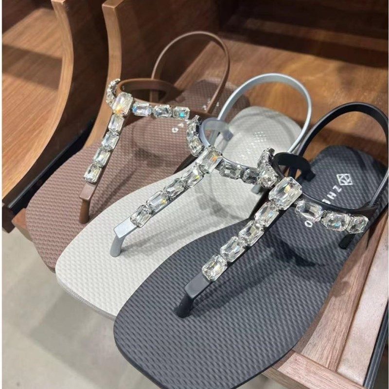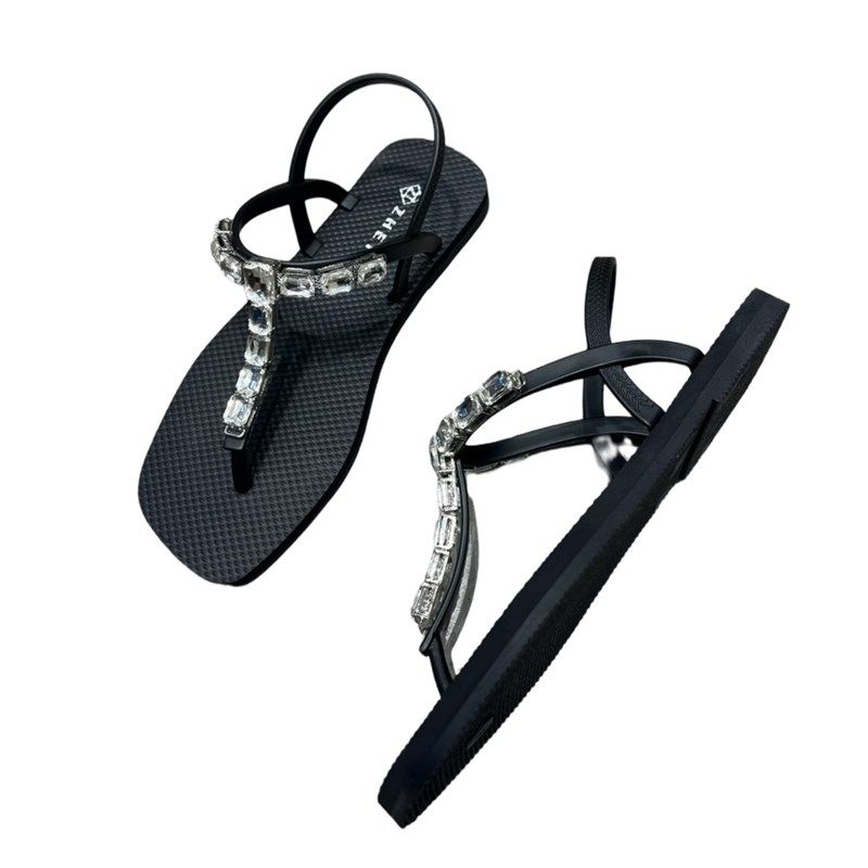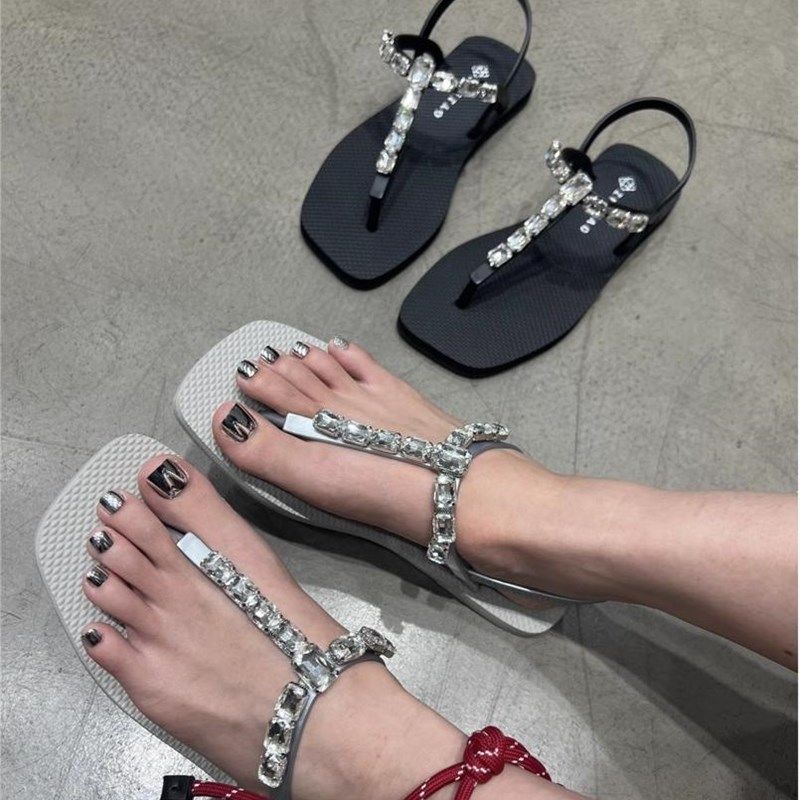 女士外穿时尚 橡胶防滑凉鞋 方头平底亮钻夹脚沙滩凉拖 新品 2024夏季