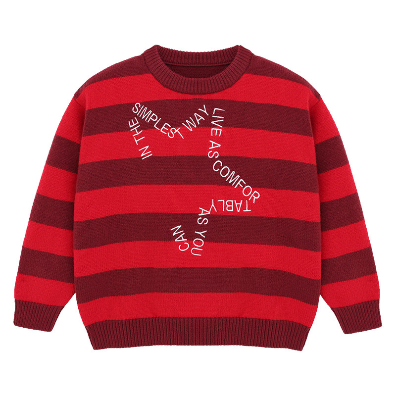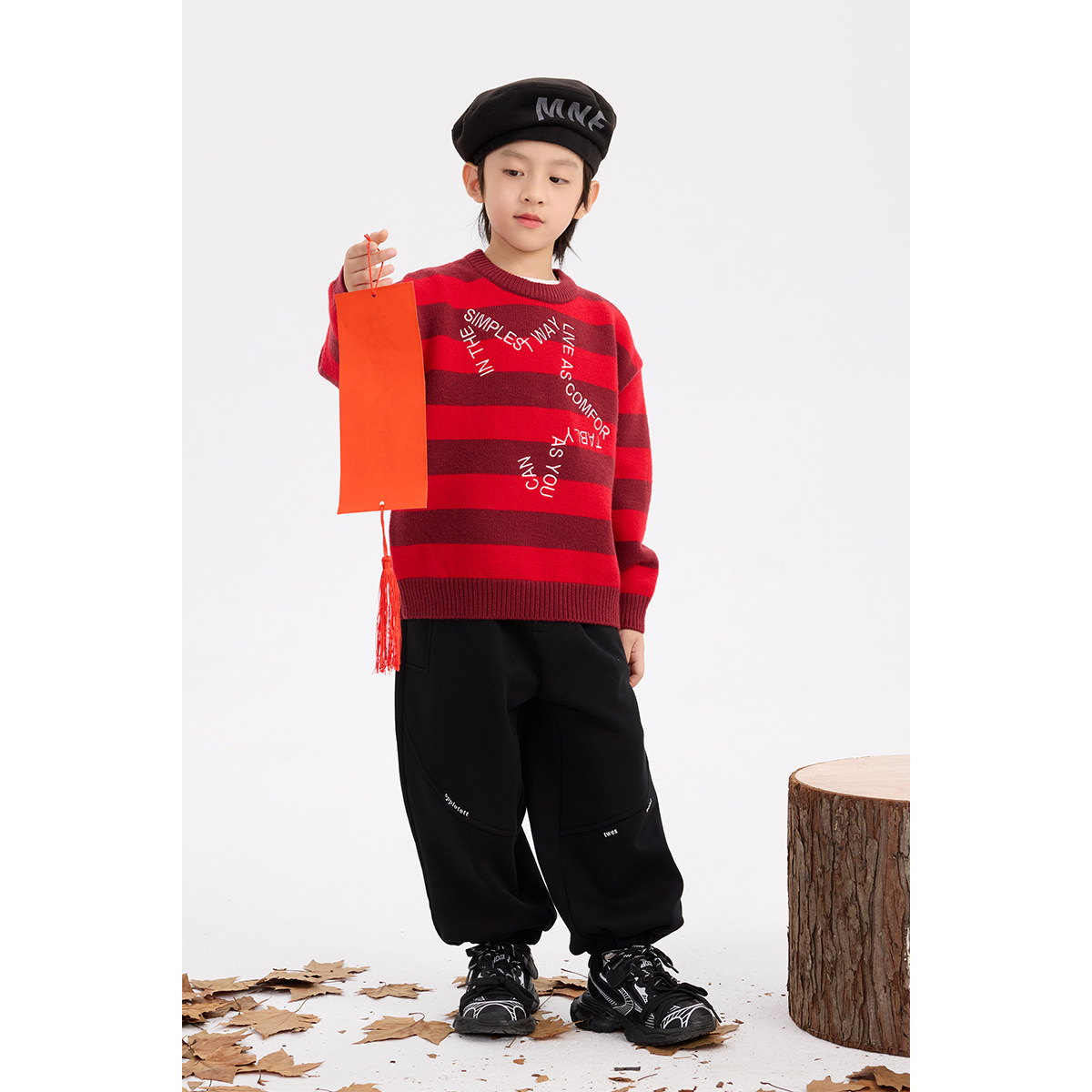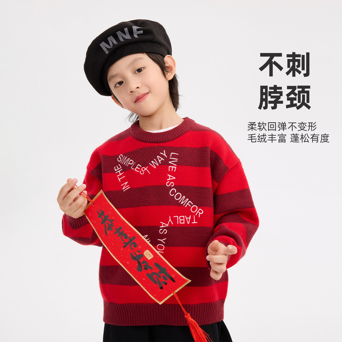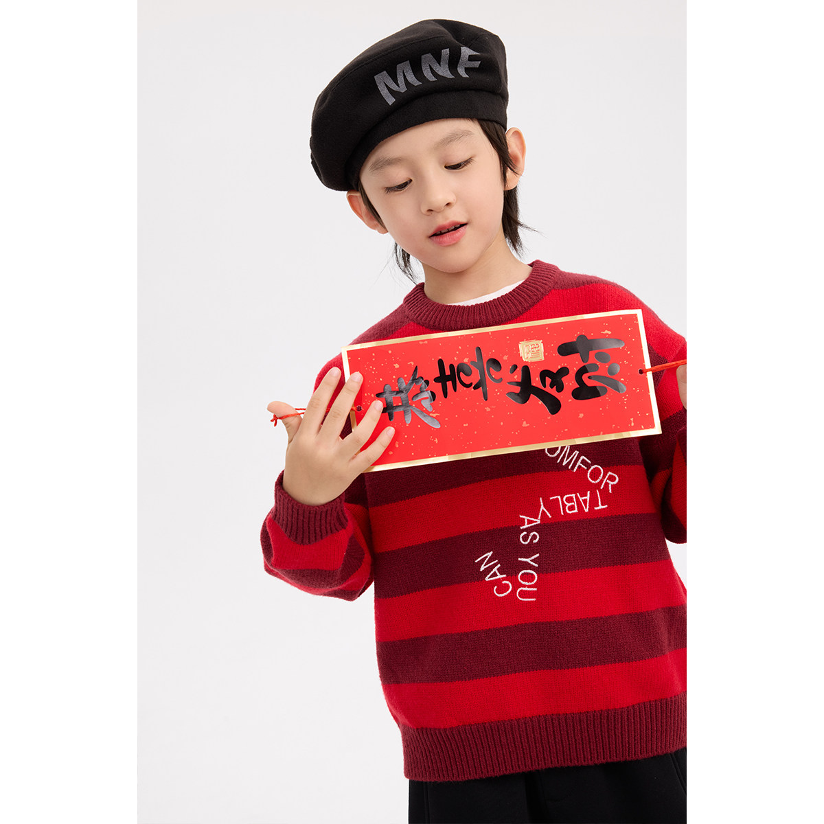 男孩新年衣服 冬装 派町童装 男女童撞色圆领红色毛衣儿童保暖针织衫