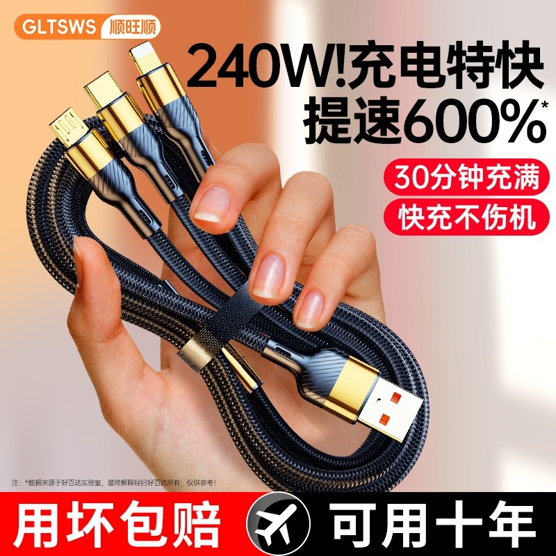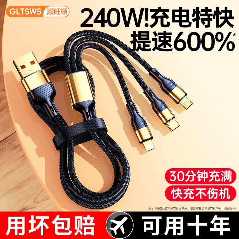 300W超级快充数据线三合一全协议适用苹果16promax 14华为OPPO小米vivo一拖三充电线平板通用