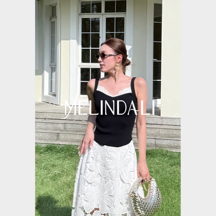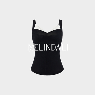 海鸥领蕾丝撞色修身 蕾丝黑 坑条纹百搭针织背心吊带 MELINDA